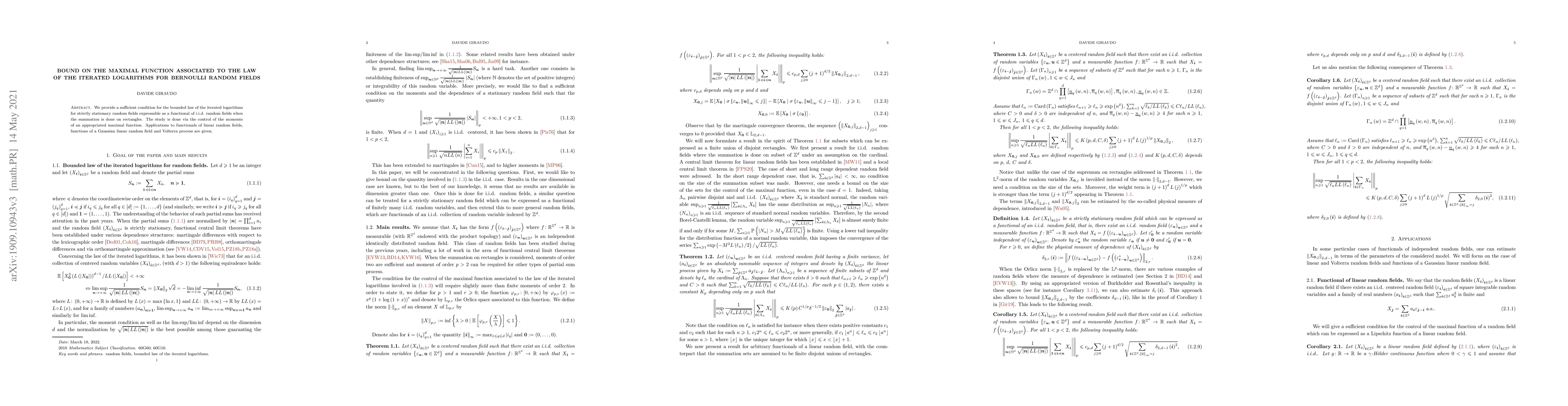 We provide a sufficient condition for the bounded law of the iterated logarithms for strictly stationary random fields expressable as a functional of i.i.d. random fields when the summation is done on rectangles. The study is done via the control of the moments of an appropriated maximal function. Applications to functionals of linear random fields, functions of a Gaussian linear random field and Volterra process are given.