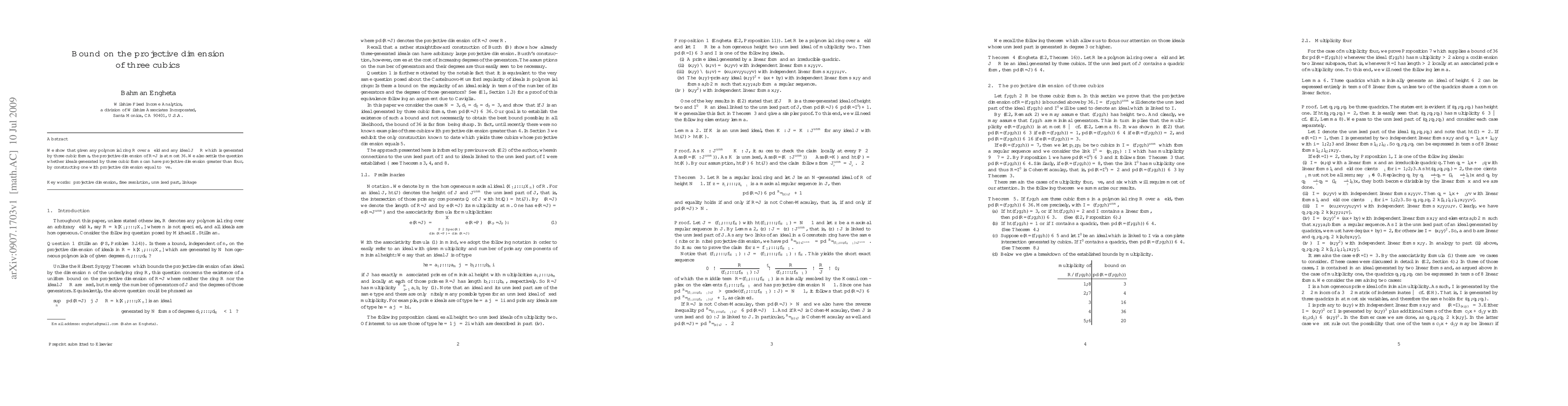This paper provides an upper bound of 36 for the projective dimension of a quotient ring formed by an ideal generated by three cubic forms in a polynomial ring over a field. It also constructs an example of such an ideal with a projective dimension of exactly 5, confirming that dimensions greater than 4 are possible.