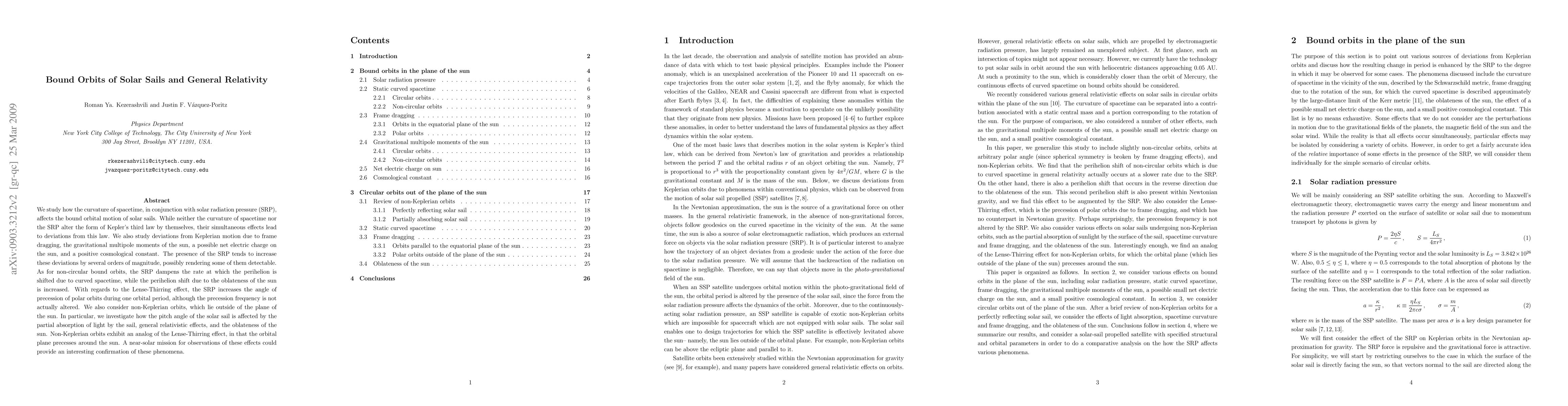 This paper explores the combined effects of general relativity and solar radiation pressure on the bound orbital motion of solar sails, revealing significant deviations from Keplerian motion. It also investigates the influence of frame dragging, solar multipole moments, and a cosmological constant on these dynamics, suggesting that solar sails could provide a unique observational platform for confirming these relativistic effects.