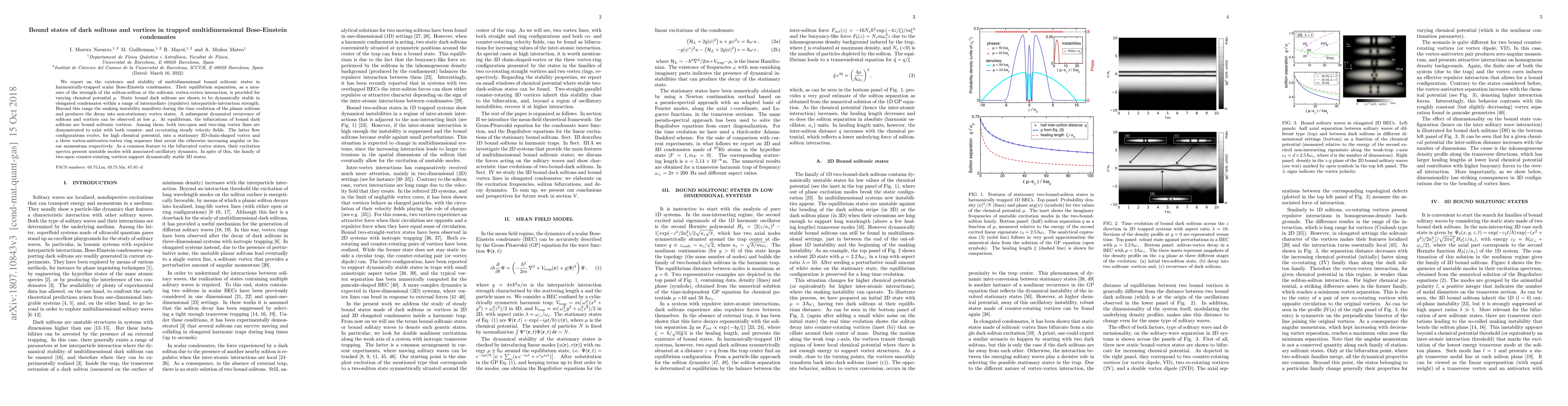 We report on the existence and stability of multidimensional bound solitonic states in harmonically-trapped scalar Bose-Einstein condensates. Their equilibrium separation, as a measure of the strength of the soliton-soliton or the solitonic vortex-vortex interaction, is provided for varying chemical potential $\mu$. Static bound dark solitons are shown to be dynamically stable in elongated condensates within a range of intermediate (repulsive) interparticle-interaction strength. Beyond this range the snaking instability manifests during the time evolution of the planar solitons and produces the decay into non-stationary vortex states. A subsequent dynamical recurrence of solitons and vortices can be observed at low $\mu$. At equilibrium, the bifurcations of bound dark solitons are bound solitonic vortices. Among them, both two-open and two-ring vortex lines are demonstrated to exist with both counter- and co-rotating steady velocity fields. The latter flow configurations evolve, for high chemical potential, into a stationary 3D-chain-shaped vortex and a three vortex-antivortex-vortex ring sequence that arrest the otherwise increasing angular or linear momentum respectively. As a common feature to the bifurcated vortex states, their excitation spectra present unstable modes with associated oscillatory dynamics.