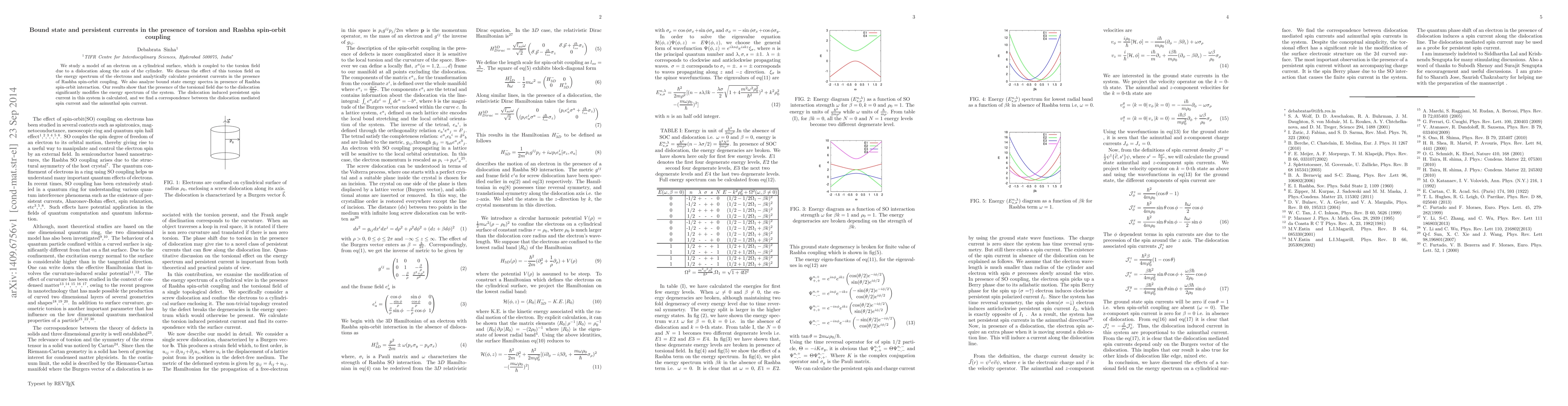 We study a model of an electron on a cylindrical surface, which is coupled to the torsion field due to a dislocation along the axis of the cylinder. We discuss the effect of this torsion field on the energy spectrum of the electrons and analytically calculate persistent currents in the presence of Rashba spin-orbit coupling. We also analyze bound state energy spectra in presence of Rashba spin-orbit interaction. Our results show that the presence of the torsional field due to the dislocation significantly modifies the energy spectrum of the system. The dislocation induced persistent spin current in this system is calculated, and we find a correspondence between the dislocation mediated spin current and the azimuthal spin current.