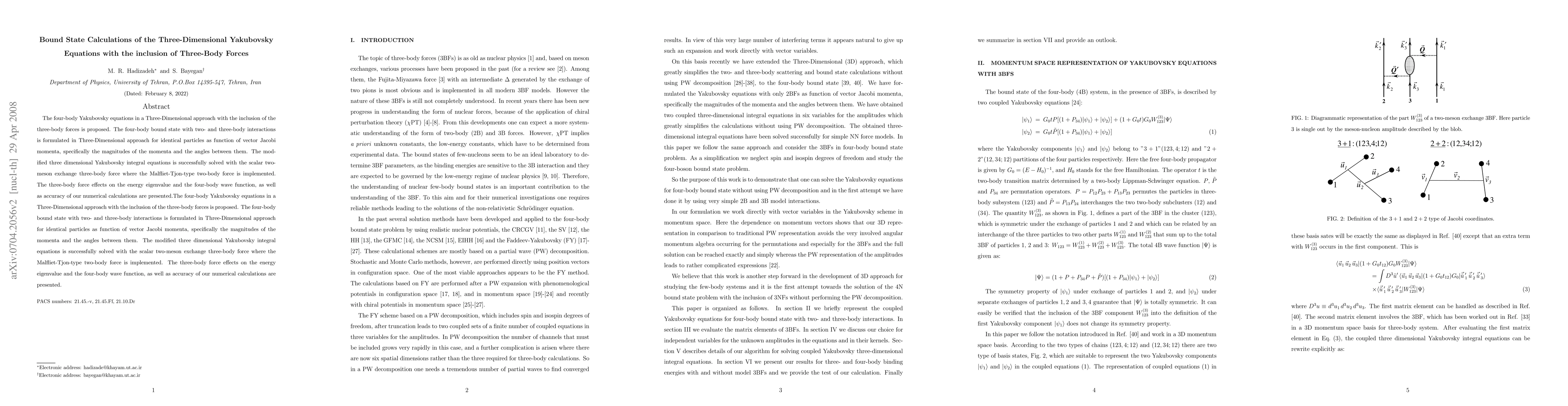 This paper proposes a three-dimensional approach to solving the four-body Yakubovsky equations, incorporating three-body forces, and formulates the four-body bound state with two- and three-body interactions. The modified Yakubovsky integral equations are solved using a scalar two-meson exchange three-body force, and the effects of these forces on energy eigenvalues and the four-body wave function are analyzed.