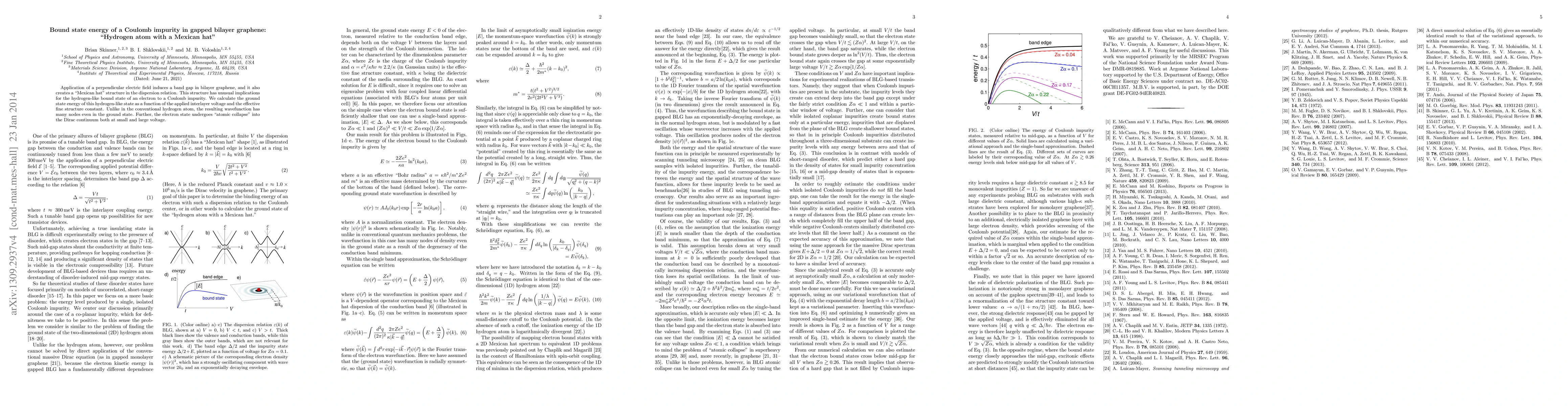 Application of a perpendicular electric field induces a band gap in bilayer graphene, and it also creates a "Mexican hat" structure in the dispersion relation. This structure has unusual implications for the hydrogen-like bound state of an electron to a Coulomb impurity. We calculate the ground state energy of this hydrogen-like state as a function of the applied interlayer voltage and the effective fine structure constant. Unlike in the normal hydrogen atom, the resulting wavefunction has many nodes even in the ground state. Further, the electron state undergoes "atomic collapse" into the Dirac continuum both at small and large voltage.