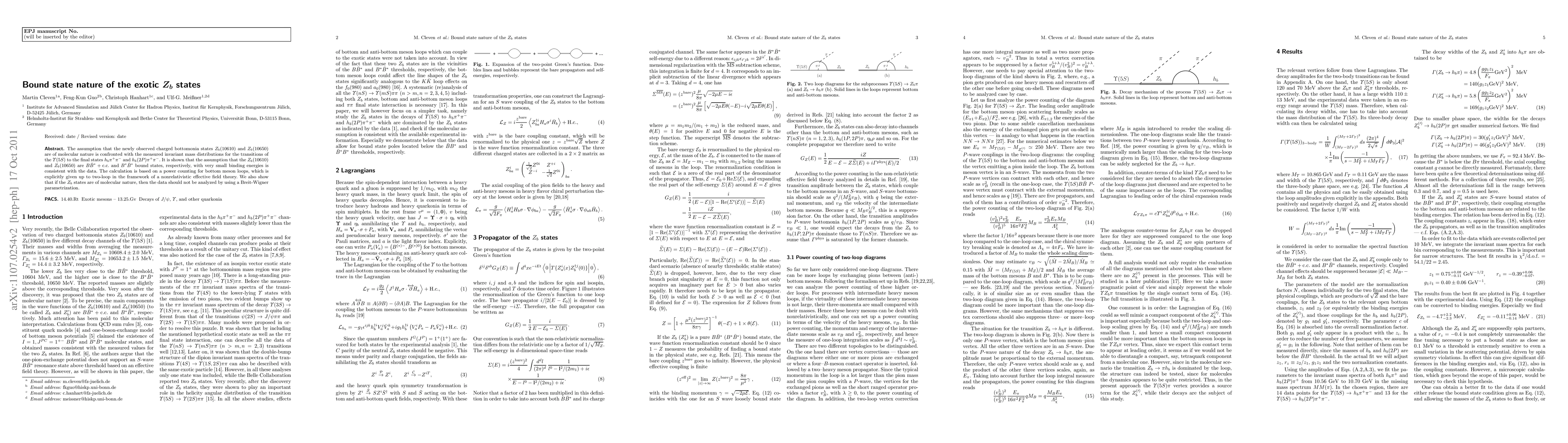 The study supports interpreting the exotic Z_b states as loosely bound molecular states of bottom mesons, consistent with experimental data. It emphasizes that such states should not be analyzed with simple Breit-Wigner models, using advanced effective field theory calculations to reach these conclusions.