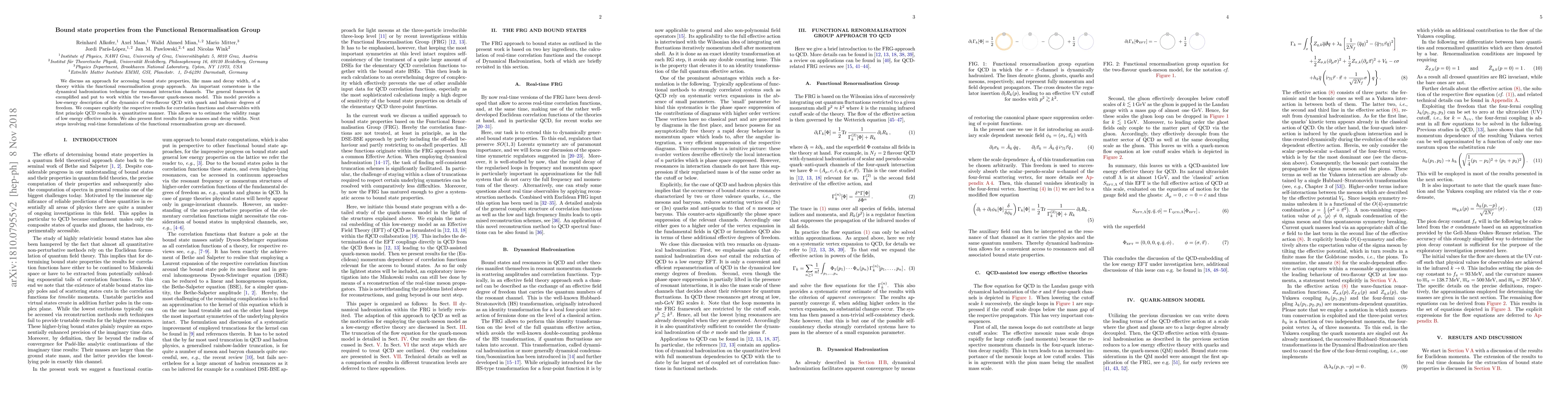 We discuss an approach for accessing bound state properties, like mass and decay width, of a theory within the functional renormalisation group approach. An important cornerstone is the dynamical hadronization technique for resonant interaction channels. The general framework is exemplified and put to work within the two-flavour quark-meson model. This model provides a low-energy description of the dynamics of two-flavour QCD with quark and hadronic degrees of freedom. We compare explicitly the respective results for correlation functions and observables with first principle QCD results in a quantitative manner. This allows us to estimate the validity range of low energy effective models. We also present first results for pole masses and decay widths. Next steps involving real-time formulations of the functional renormalisation group are discussed.