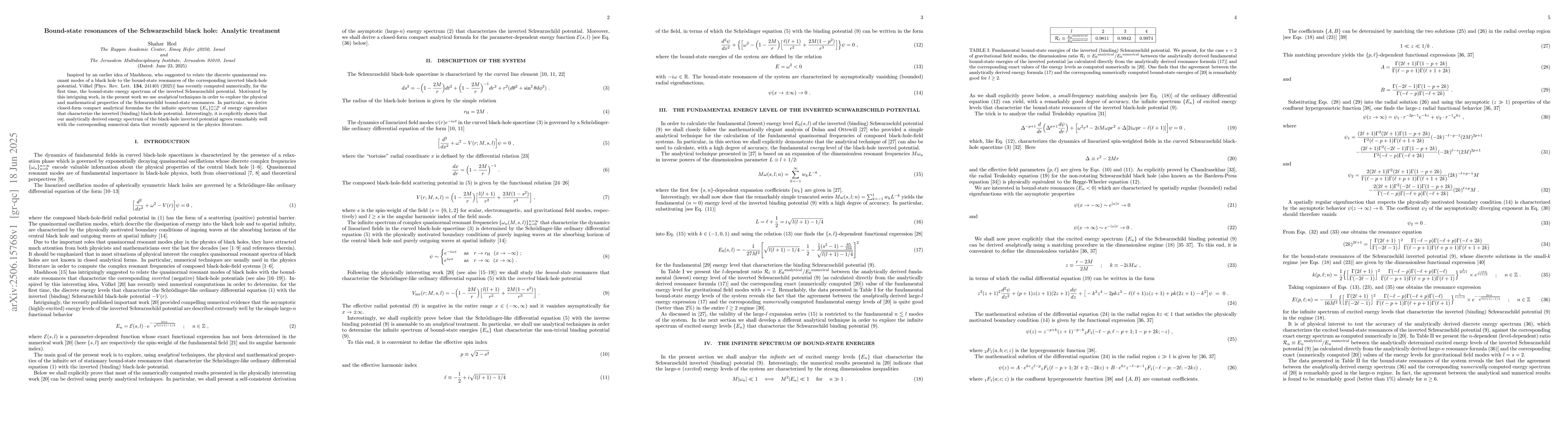 Inspired by an earlier idea of Mashhoon, who suggested to relate the discrete quasinormal resonant modes of a black hole to the bound-state resonances of the corresponding inverted black-hole potential, V\"olkel [Phys. Rev. Lett. {\bf 134}, 241401 (2025)] has recently computed numerically, for the first time, the bound-state energy spectrum of the inverted Schwarzschild potential. Motivated by this intriguing work, in the present work we use {\it analytical} techniques in order to explore the physical and mathematical properties of the Schwarzschild bound-state resonances. In particular, we derive closed-form compact analytical formulas for the infinite spectrum $\{E_n\}_{n=0}^{n=\infty}$ of energy eigenvalues that characterize the inverted (binding) black-hole potential. Interestingly, it is explicitly shown that our analytically derived energy spectrum of the black-hole inverted potential agrees remarkably well with the corresponding numerical data that recently appeared in the physics literature.