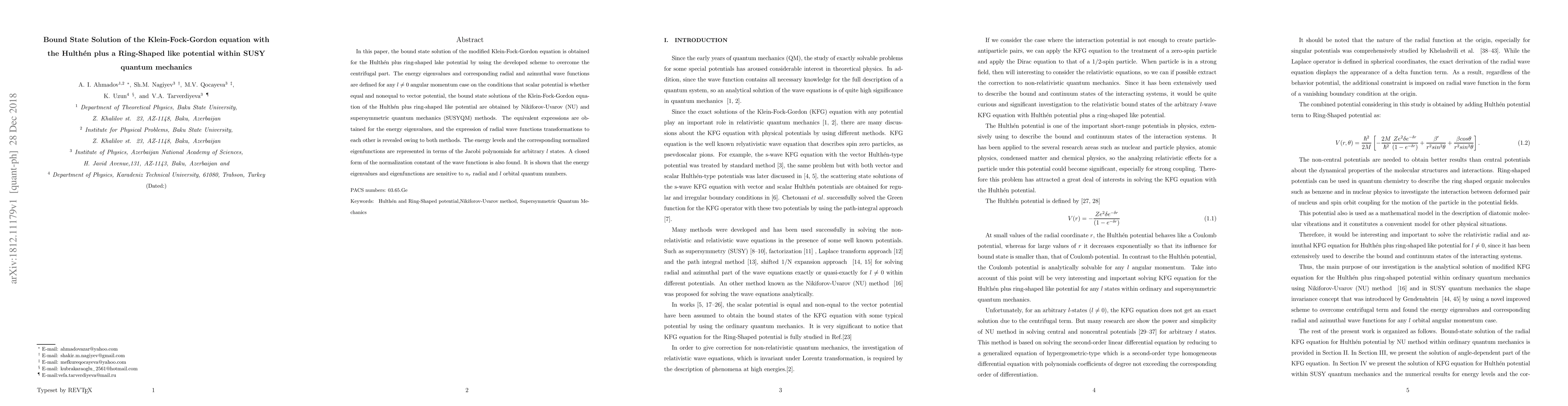 In this paper, the bound state solution of the modified Klein-Fock-Gordon equation is obtained for the Hulth\'en plus ring-shaped lake potential by using the developed scheme to overcome the centrifugal part. The energy eigenvalues and corresponding radial and azimuthal wave functions are defined for any $l\neq0$ angular momentum case on the conditions that scalar potential is whether equal and nonequal to vector potential, the bound state solutions of the Klein-Fock-Gordon equation of the Hulth\'en plus ring-shaped like potential are obtained by Nikiforov-Uvarov (NU) and supersymmetric quantum mechanics (SUSYQM) methods. The equivalent expressions are obtained for the energy eigenvalues, and the expression of radial wave functions transformations to each other is revealed owing to both methods. The energy levels and the corresponding normalized eigenfunctions are represented in terms of the Jacobi polynomials for arbitrary $l$ states. A closed form of the normalization constant of the wave functions is also found. It is shown that the energy eigenvalues and eigenfunctions are sensitive to $n_r$ radial and $l$ orbital quantum numbers.
