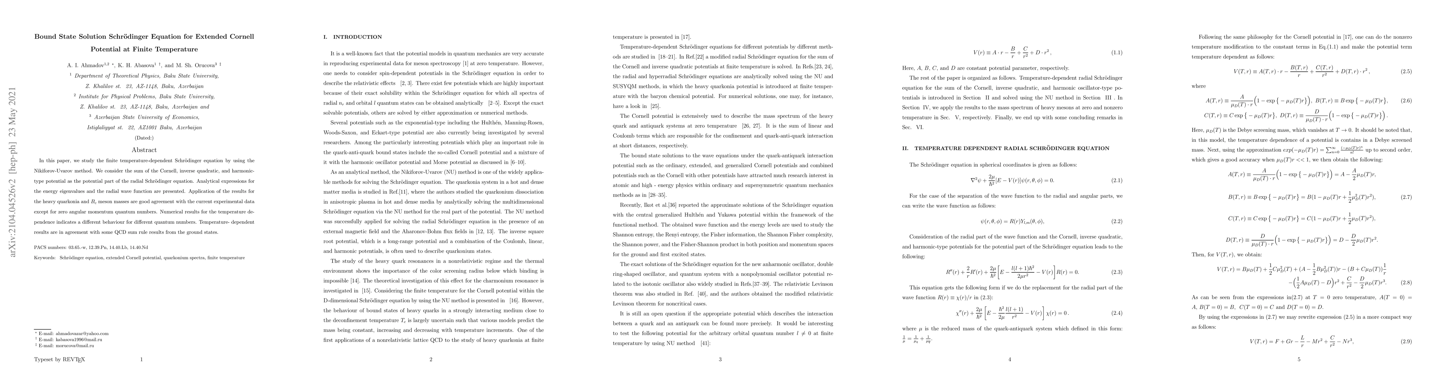 This paper investigates the finite temperature-dependent Schrödinger equation using the Nikiforov-Uvarov method for an extended Cornell potential, yielding analytical expressions for energy eigenvalues and radial wave functions. The results show good agreement with experimental data for heavy quarkonia and $B_c$ meson masses, except for zero angular momentum quantum numbers, and indicate different temperature behaviors for various quantum states.