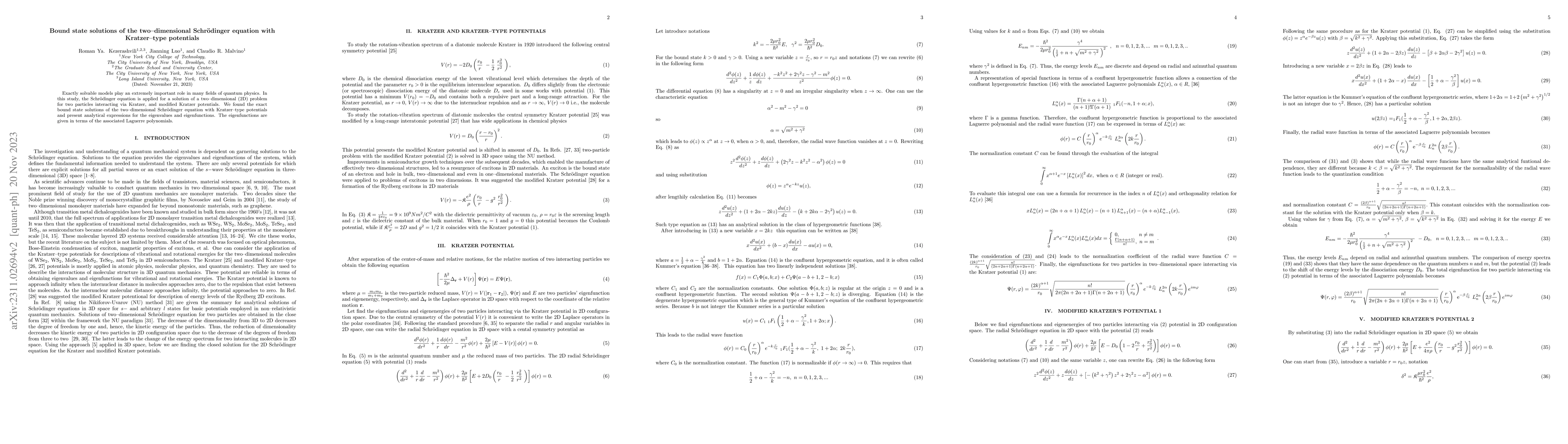 This study solves the two-dimensional Schrödinger equation for two particles interacting via Kratzer and modified Kratzer potentials, yielding exact bound state solutions. Analytical expressions for eigenvalues and eigenfunctions are provided, with eigenfunctions expressed in terms of associated Laguerre polynomials.