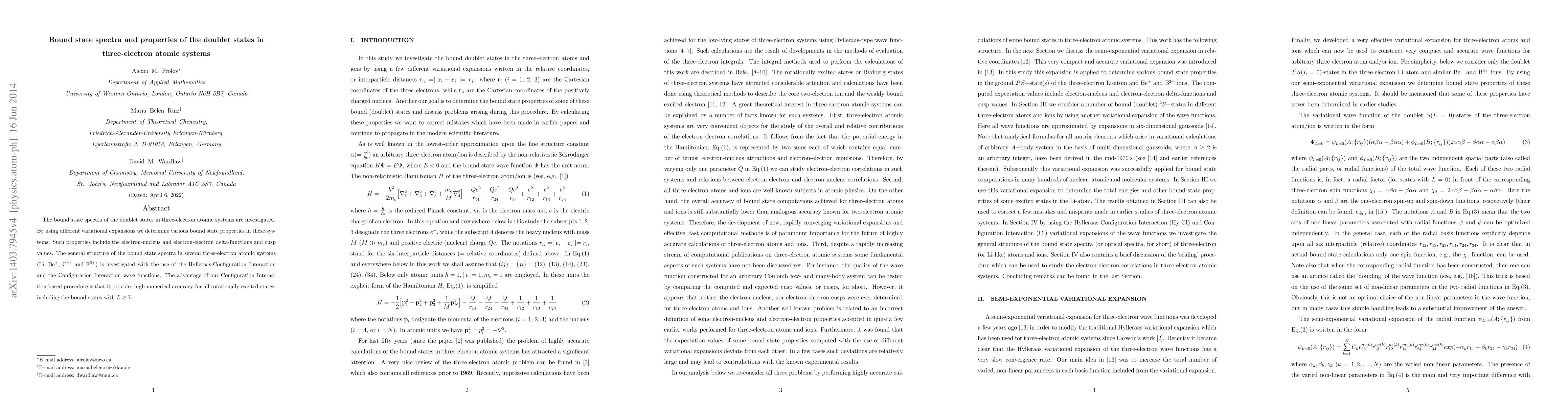 This paper investigates the bound state spectra and properties of doublet states in three-electron atomic systems using variational expansions. It determines electron-nucleus and electron-electron interactions, focusing on delta-functions and cusp values, and applies the Hylleraas-Configuration Interaction and Configuration Interaction methods for high numerical accuracy across various systems, including Li, Be+, C3+, and F6+.