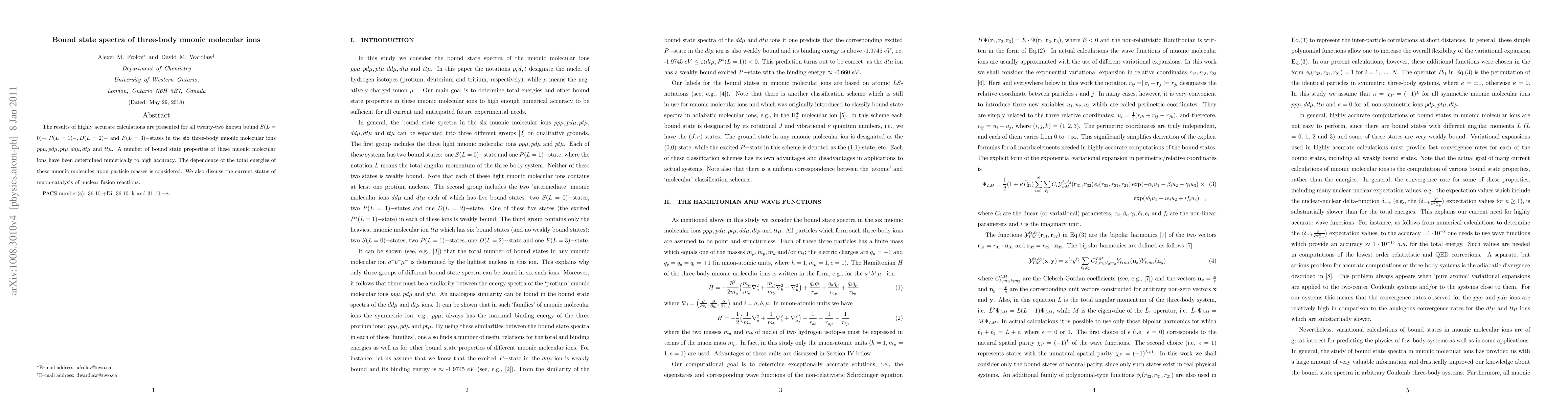 The results of highly accurate calculations are presented for all twenty-two known bound $S(L = 0)-, P(L = 1)-, D(L = 2)-$ and $F(L = 3)-$states in the six three-body muonic molecular ions $pp\mu, pd\mu, pt\mu, dd\mu, dt\mu$ and $tt\mu$. A number of bound state properties of these muonic molecular ions have been determined numerically to high accuracy. The dependence of the total energies of these muonic molecules upon particle masses is considered. We also discuss the current status of muon-catalysis of nuclear fusion reactions.