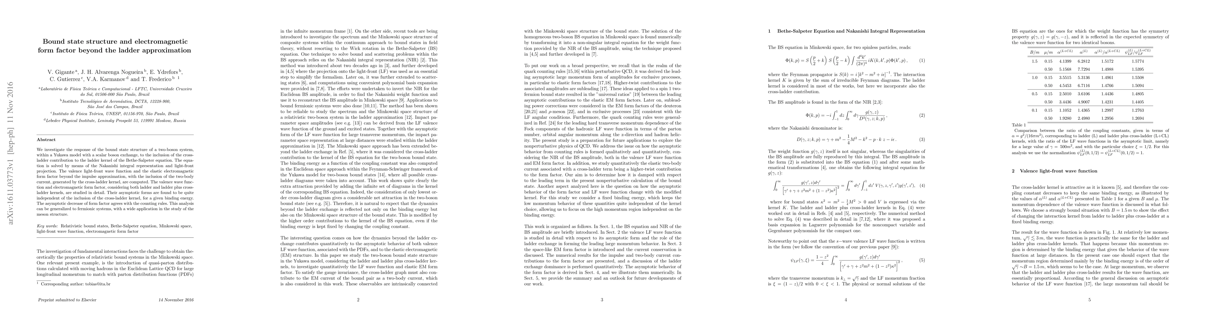 We investigate the response of the bound state structure of a two-boson system, within a Yukawa model with a scalar boson exchange, to the inclusion of the cross-ladder contribution to the ladder kernel of the Bethe-Salpeter equation. The equation is solved by means of the Nakanishi integral representation and light-front projection. The valence light-front wave function and the elastic electromagnetic form factor beyond the impulse approximation, with the inclusion of the two-body current, generated by the cross-ladder kernel, are computed. The valence wave function and electromagnetic form factor, considering both ladder and ladder plus cross-ladder kernels, are studied in detail. Their asymptotic forms are found to be quite independent of the inclusion of the cross-ladder kernel, for a given binding energy. The asymptotic decrease of form factor agrees with the counting rules. This analysis can be generalized to fermionic systems, with a wide application in the study of the meson structure.