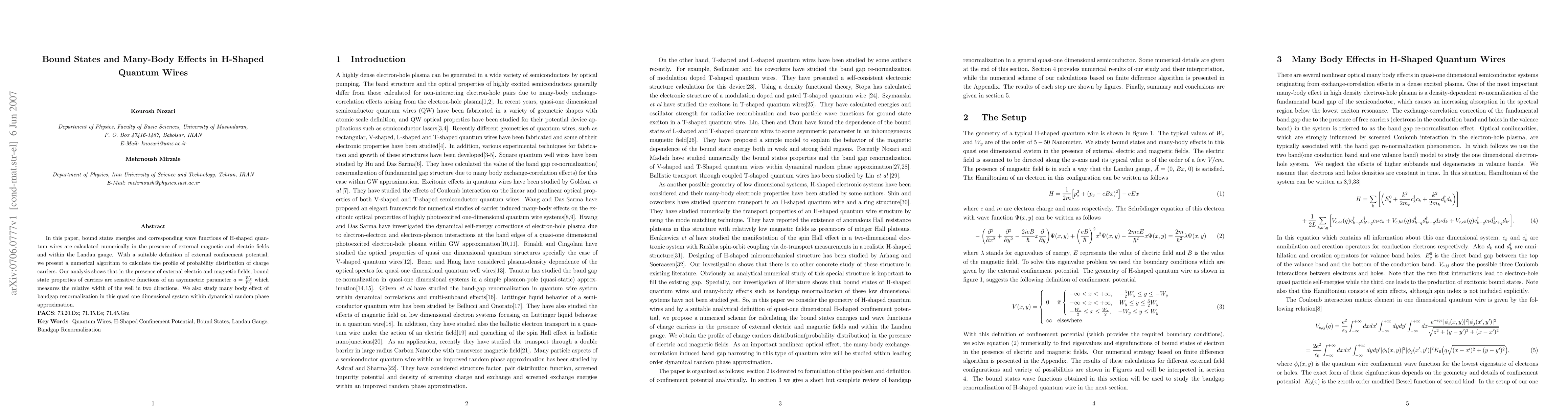 This paper numerically investigates bound states in H-shaped quantum wires under external magnetic and electric fields, revealing sensitivity to the asymmetry parameter $a$. It also explores many-body effects, specifically bandgap renormalization, using dynamical random phase approximation.