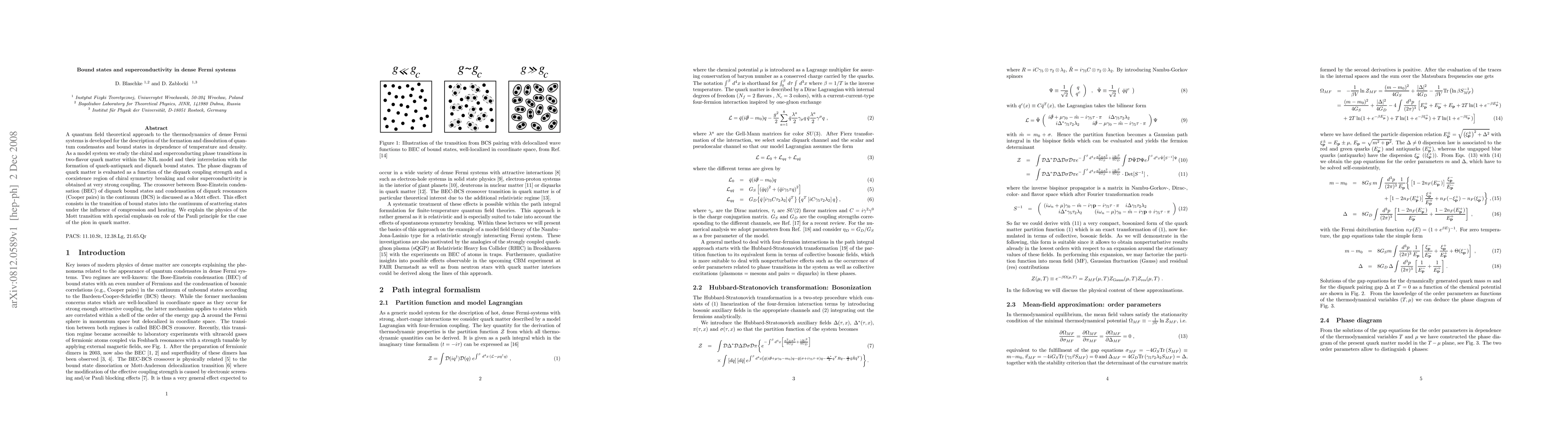 This paper develops a quantum field theoretical framework to study dense Fermi systems, focusing on the formation of quantum condensates and bound states in quark matter. It explores the interplay between chiral symmetry breaking and color superconductivity, revealing a coexistence region at strong coupling and discussing the transition from bound states to scattering states under compression and heating, termed the Mott effect.