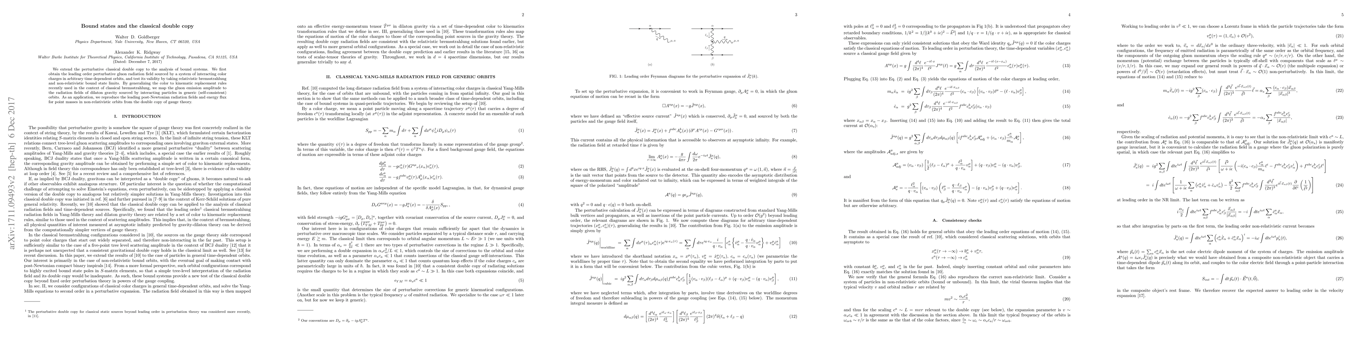 We extend the perturbative classical double copy to the analysis of bound systems. We first obtain the leading order perturbative gluon radiation field sourced by a system of interacting color charges in arbitrary time dependent orbits, and test its validity by taking relativistic bremsstrahlung and non-relativistic bound state limits. By generalizing the color to kinematic replacement rules recently used in the context of classical bremsstrahlung, we map the gluon emission amplitude to the radiation fields of dilaton gravity sourced by interacting particles in generic (self-consistent) orbits. As an application, we reproduce the leading post-Newtonian radiation fields and energy flux for point masses in non-relativistic orbits from the double copy of gauge theory.