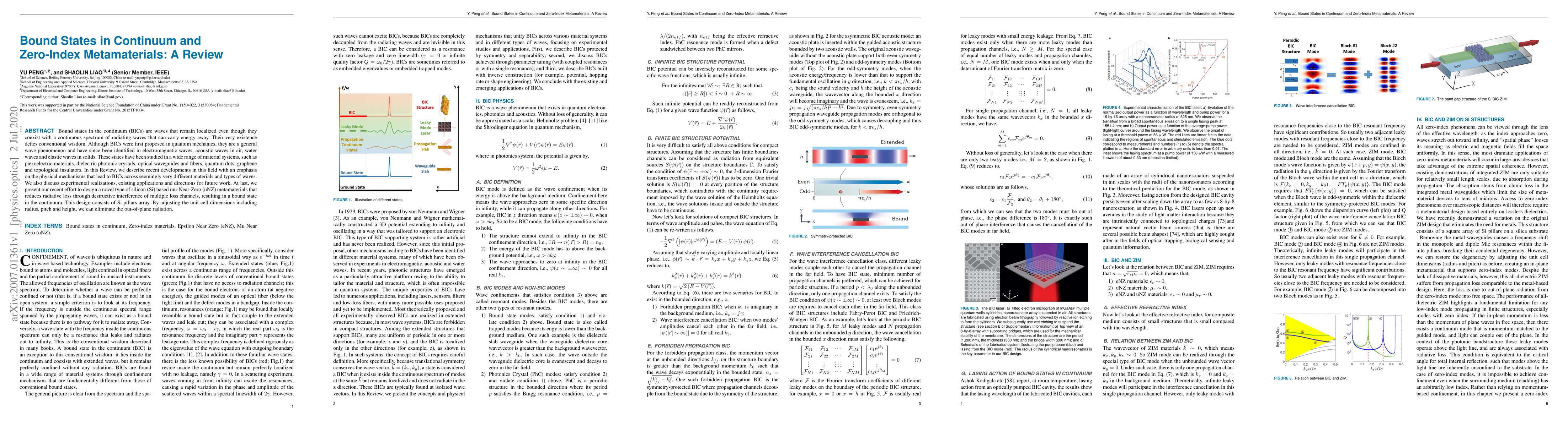 Bound states in the continuum (BICs) are waves that remain localized even though they coexist with a continuous spectrum of radiating waves that can carry energy away. Their very existence defies conventional wisdom. Although BICs were first proposed in quantum mechanics, they are a general wave phenomenon and have since been identified in electromagnetic waves, acoustic waves in air, water waves and elastic waves in solids. These states have been studied in a wide range of material systems, such as piezoelectric materials, dielectric photonic crystals, optical waveguides and fibers, quantum dots, graphene and topological insulators. In this Review, we describe recent developments in this field with an emphasis on the physical mechanisms that lead to BICs across seemingly very different materials and types of waves. We also discuss experimental realizations, existing applications and directions for future work. At last, we present our recent effort to design a novel type of silicon (Si) based mu-Near-Zero (uNZ) metamaterials that reduces radiative loss through destructive interference of multiple loss channels, resulting in a bound state in the continuum. This design consists of Si pillars array. By adjusting the unit-cell dimensions including radius, pitch and height, we can eliminate the out-of-plane radiation.