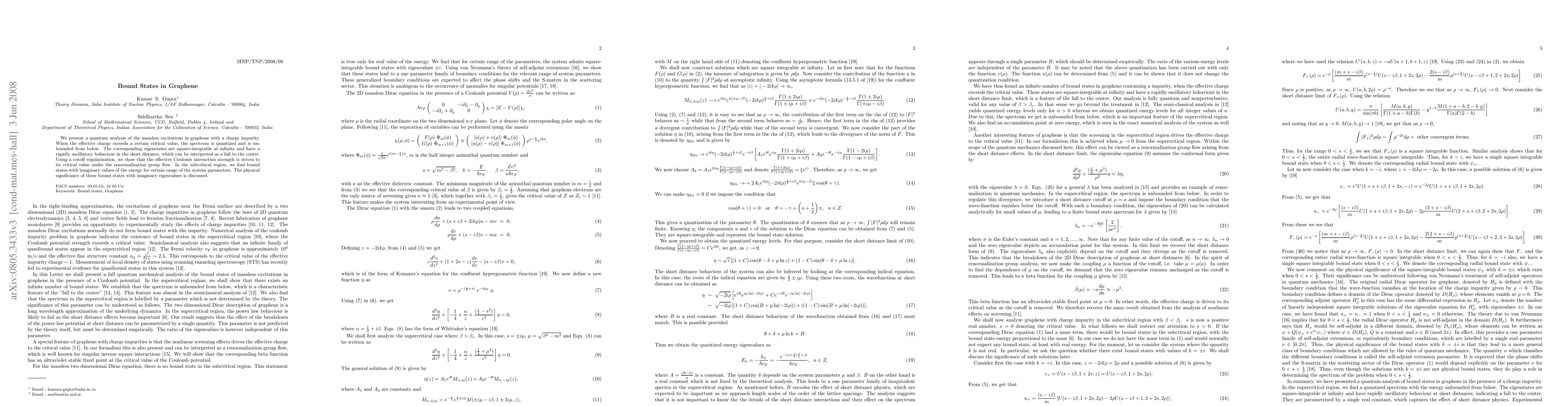We present a quantum analysis of the massless excitations in graphene with a charge impurity. When the effective charge exceeds a certain critical value, the spectrum is quantized and is unbounded from below. The corresponding eigenstates are square-integrable at infinity and have a rapidly oscillatory behaviour in the short distance, which can be interpreted as a fall to the centre. Using a cutoff regularization, we show that the effective Coulomb interaction strength is driven to its critical value under the renormalization group flow. In the subcritical region, we find bound states with imaginary values of the energy for certain range of the system parameters. The physical significance of these bound states with imaginary eigenvalues is discussed.