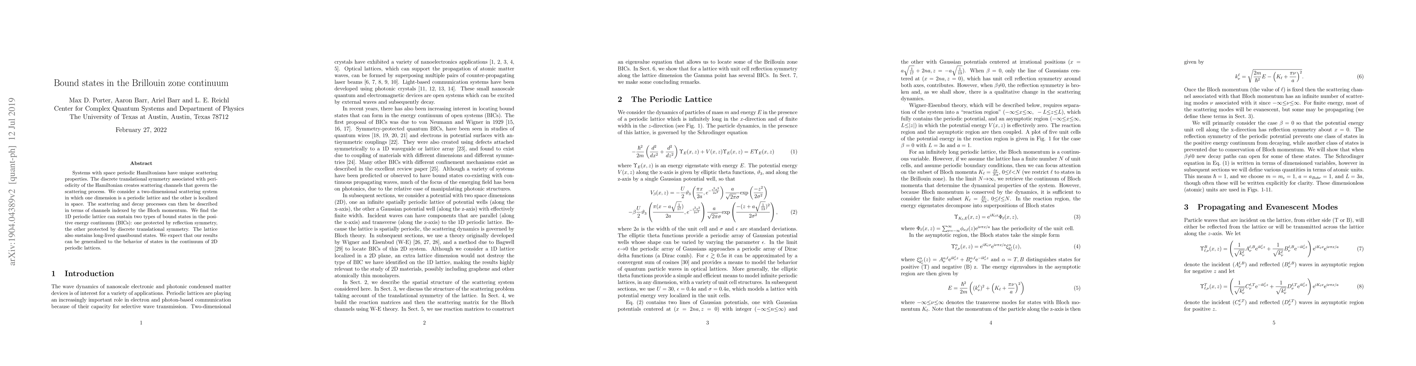 Systems with space-periodic Hamiltonians have unique scattering properties. The discrete translational symmetry associated with periodicity of the Hamiltonian creates scattering channels that govern the scattering process. We consider a two-dimensional scattering system in which one dimension is a periodic lattice and the other is localized in space. The scattering and decay processes can then be described in terms of channels indexed by the Bloch momentum. We find the 1D periodic lattice can sustain two types of bound states in the positive energy continuum (BICs): one protected by reflection symmetry, the other protected by discrete translational symmetry. The lattice also sustains long-lived quasibound states. We expect that our results can be generalized to the behavior of states in the continuum of 2D periodic lattices.