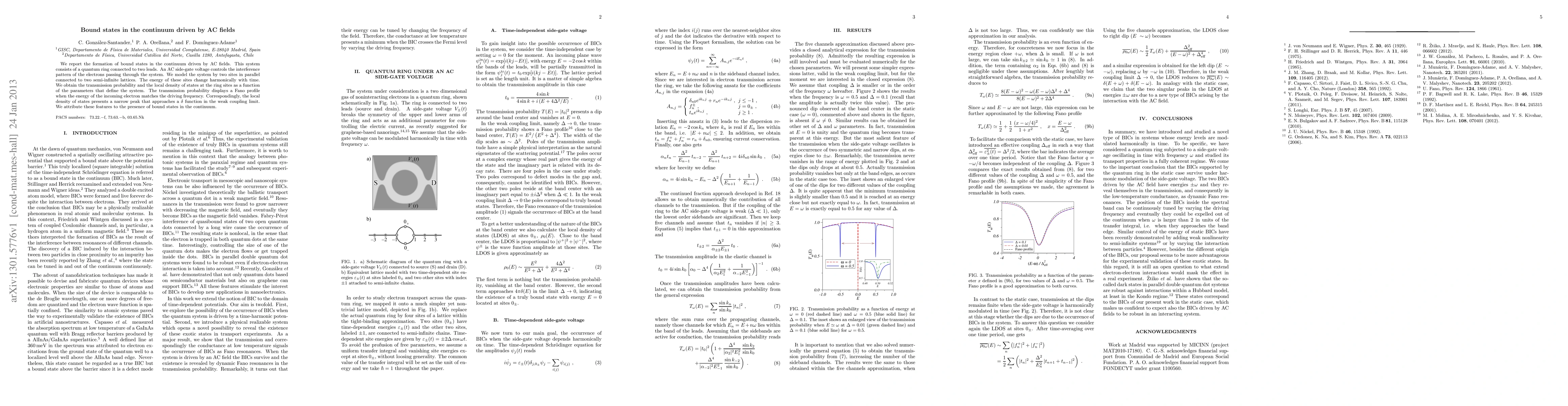 Researchers create bound states in a quantum ring driven by alternating current fields, resulting in Fano profiles and narrow peaks in transmission probability and local density of states.