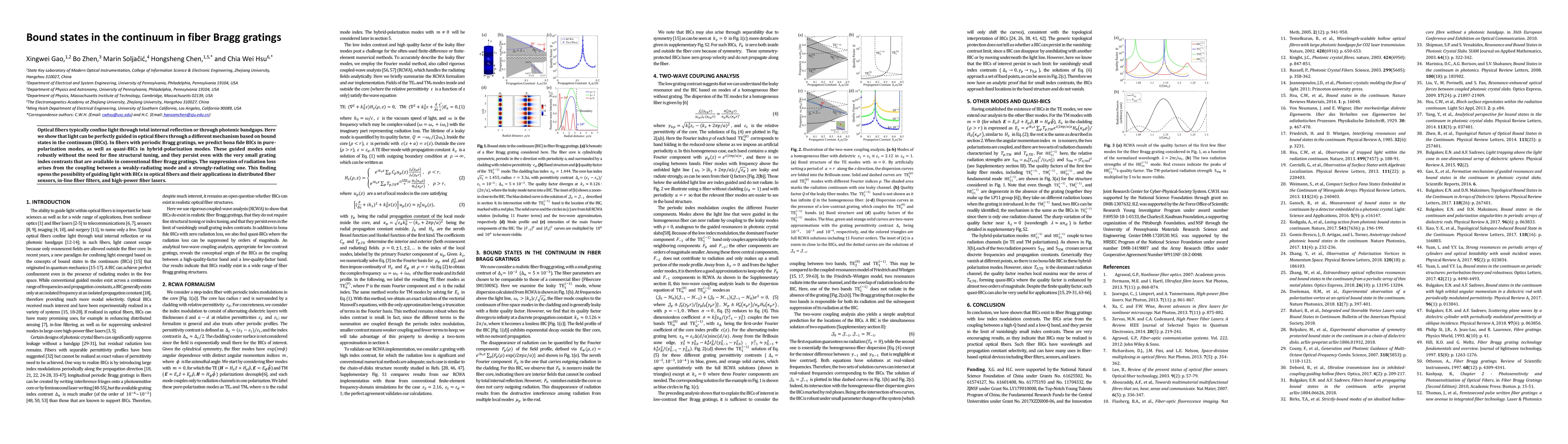 This paper demonstrates the existence of bound states in the continuum (BICs) in fiber Bragg gratings, allowing light to be guided without typical confinement methods. These BICs provide robust, radiation-loss-suppressed guidance even with minimal grating index contrasts, promising applications in fiber sensors, filters, and lasers.