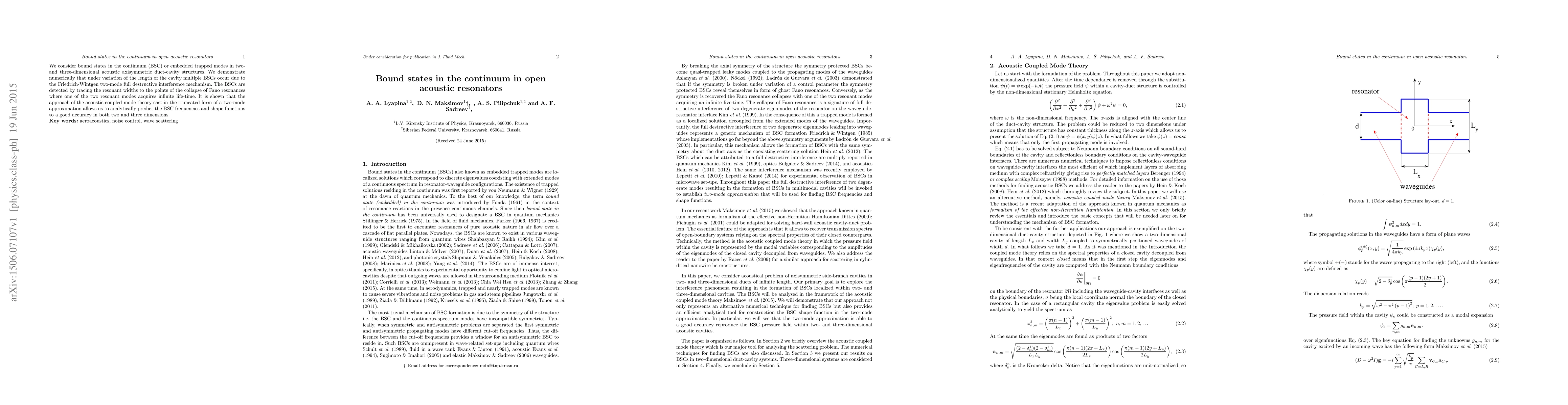 This paper investigates bound states in the continuum (BSC) in two- and three-dimensional acoustic resonators, demonstrating numerically that BSCs arise due to destructive interference. Analytical predictions using truncated acoustic coupled mode theory accurately match the numerical findings for BSC frequencies and shapes.
