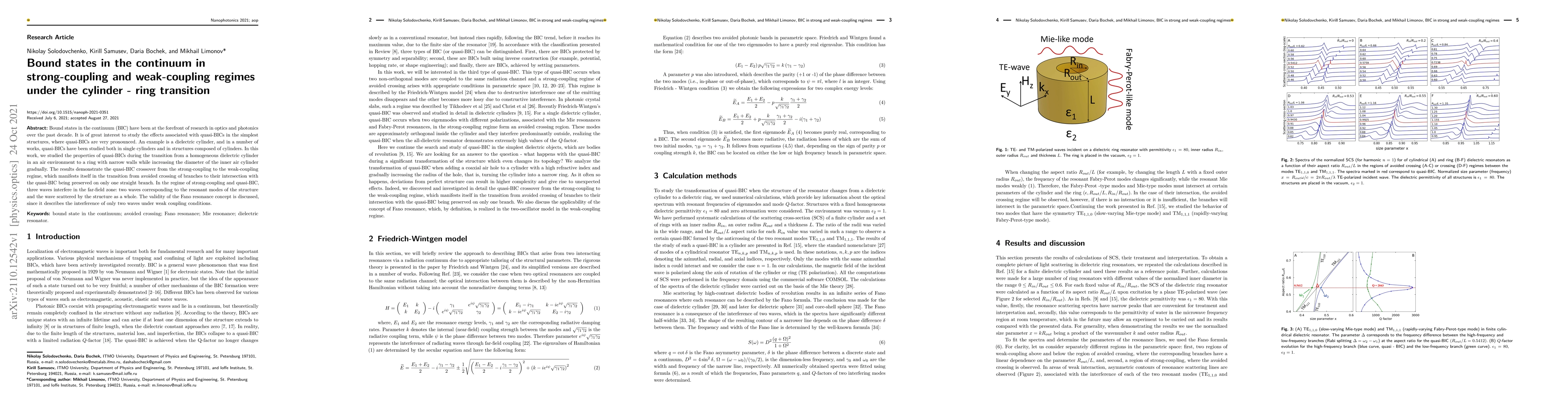 This paper investigates the transition of bound states in the continuum (BIC) in dielectric cylinders transitioning to ring structures, showing how quasi-BICs shift from strong-coupling to weak-coupling regimes. The study highlights the transition from avoided crossing to mode intersection, and discusses the relevance of the Fano resonance in weak coupling conditions.