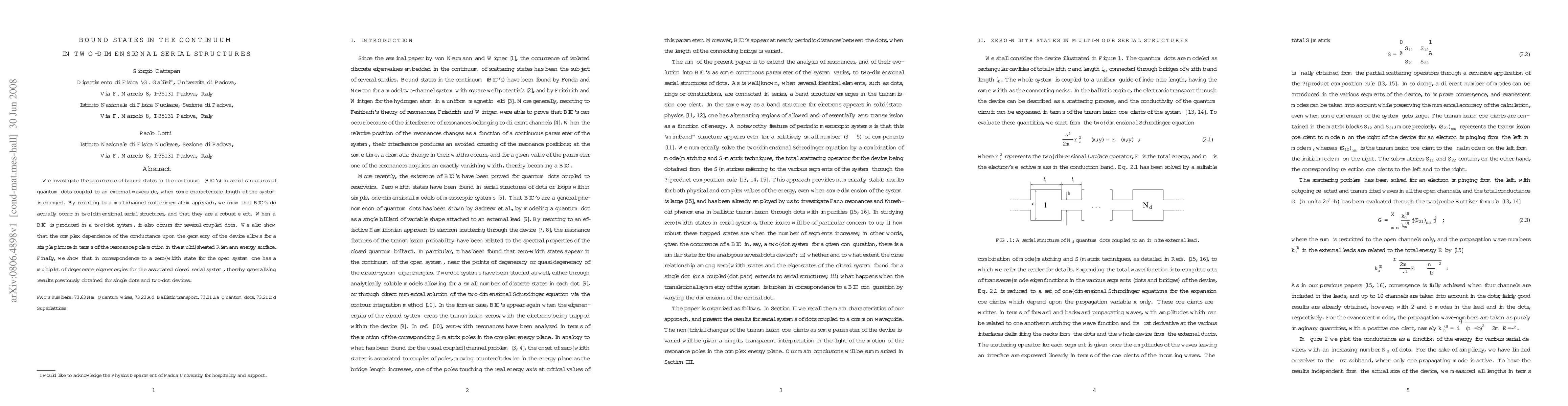 This paper explores bound states in the continuum (BIC's) in two-dimensional serial structures of quantum dots linked to an external waveguide, demonstrating their robustness using a multichannel scattering-matrix approach. The study reveals that BIC's are influenced by the geometry of the device, leading to a complex conductance dependence and a generalized understanding of zero-width states in closed systems.