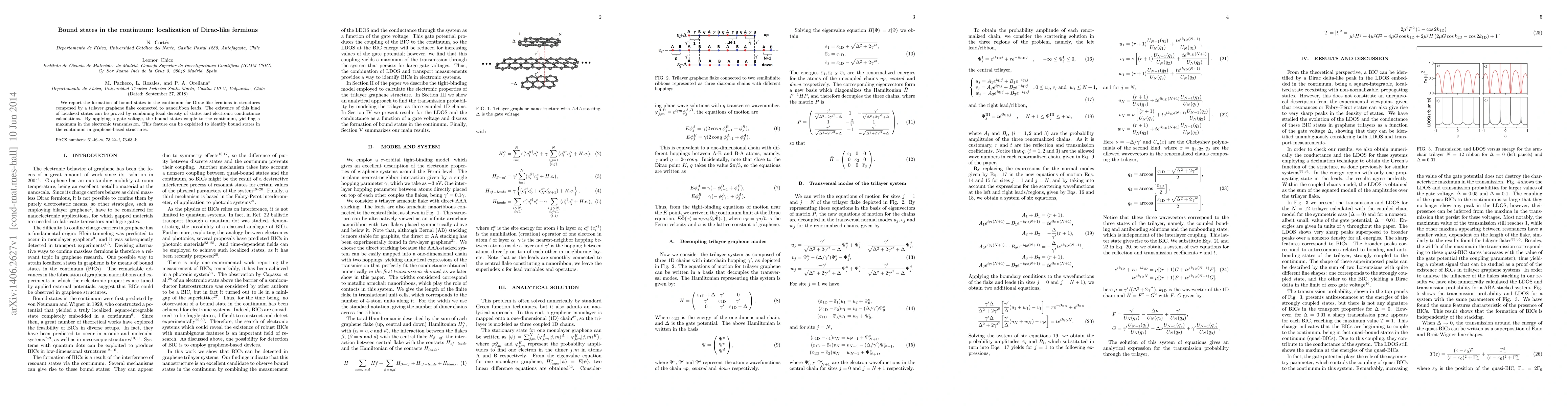 This paper reports the formation of localized bound states in the continuum for Dirac-like fermions in trilayer graphene connected to nanoribbon leads, demonstrated through local density of states and conductance calculations. Applying a gate voltage enables coupling of these states to the continuum, resulting in a peak in electronic transmission.
