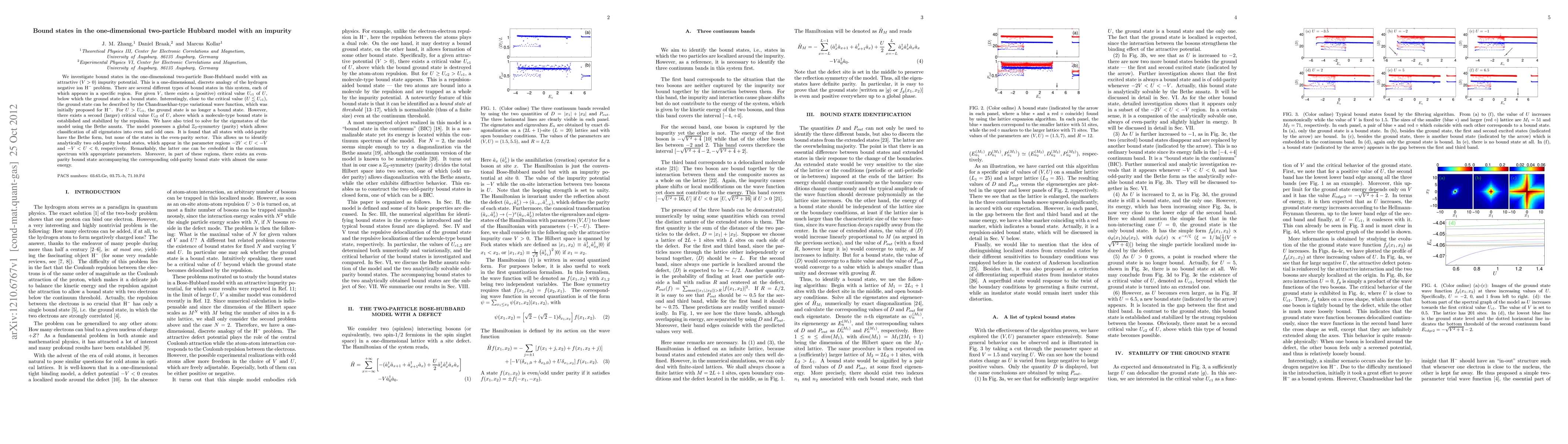 This paper explores bound states in a one-dimensional two-particle Bose-Hubbard model with an attractive impurity, comparing it to the hydrogen negative ion problem. It identifies critical values for the interaction strength that determine the existence and type of bound states, and uses the Bethe ansatz to classify eigenstates, finding two odd-parity bound states and a potential even-parity bound state in specific parameter regions.