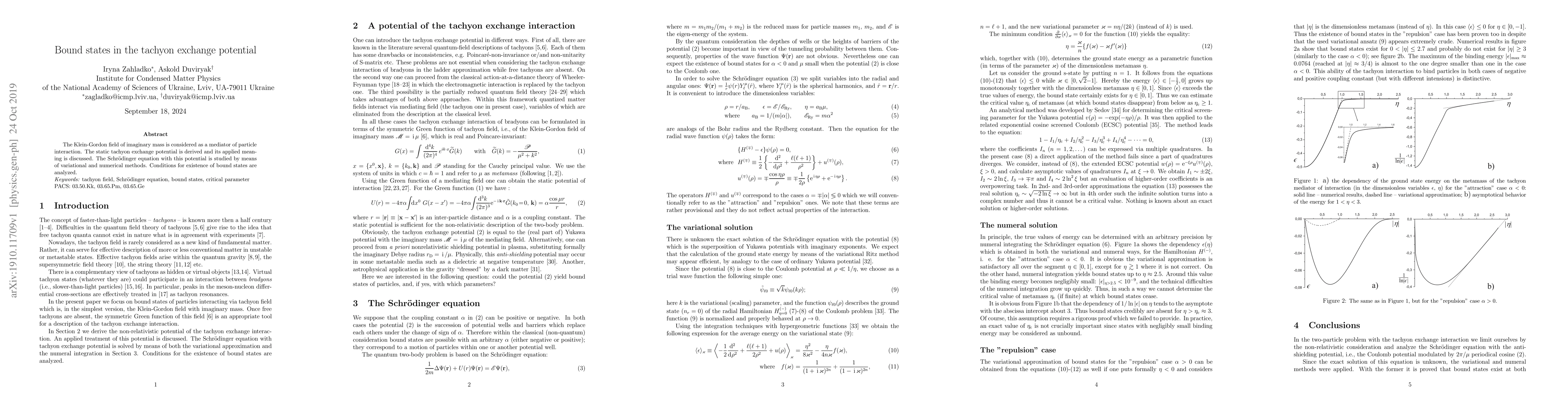 This paper investigates the static tachyon exchange potential derived from the Klein-Gordon field of imaginary mass, and explores its implications for particle interactions. It employs variational and numerical methods to study the Schrödinger equation with this potential and analyzes conditions for the existence of bound states.