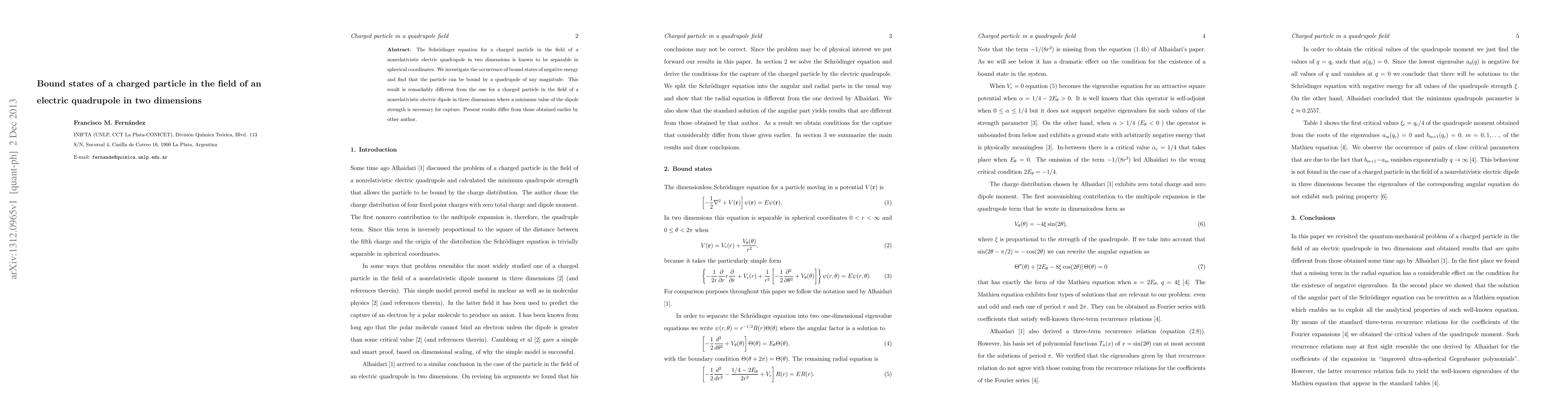 This study explores bound states of a charged particle in a two-dimensional electric quadrupole field, revealing that such particles can be captured regardless of quadrupole strength, contrasting with the three-dimensional dipole field where a minimum dipole strength is required. The findings diverge from previous results by other researchers.