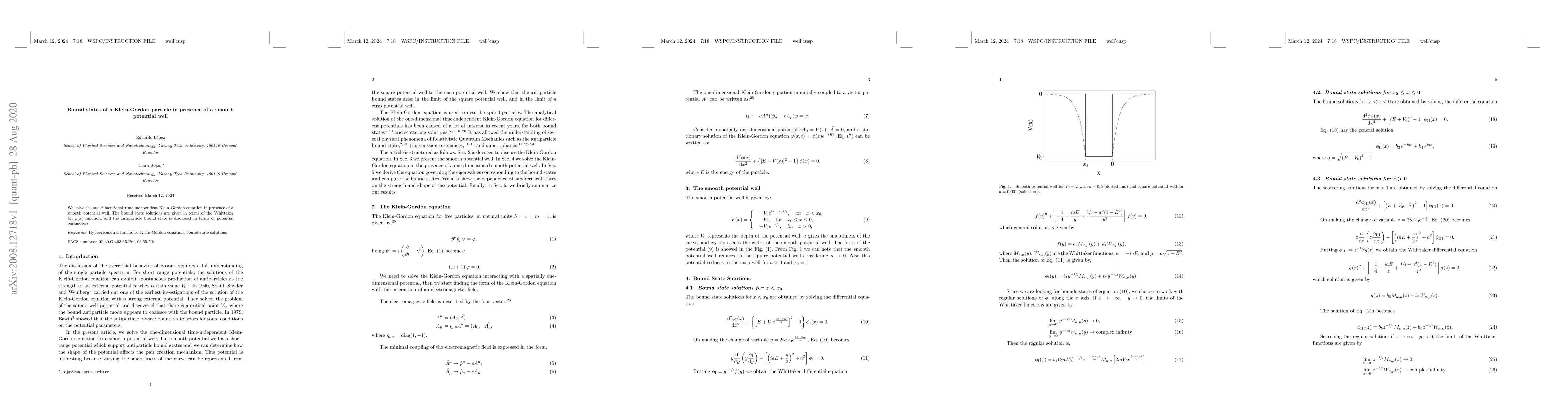 Researchers solved the Klein-Gordon equation for a particle in a smooth potential well, finding bound states that can be expressed using the Whittaker function, with parameters controlling the nature of antiparticle bound states.