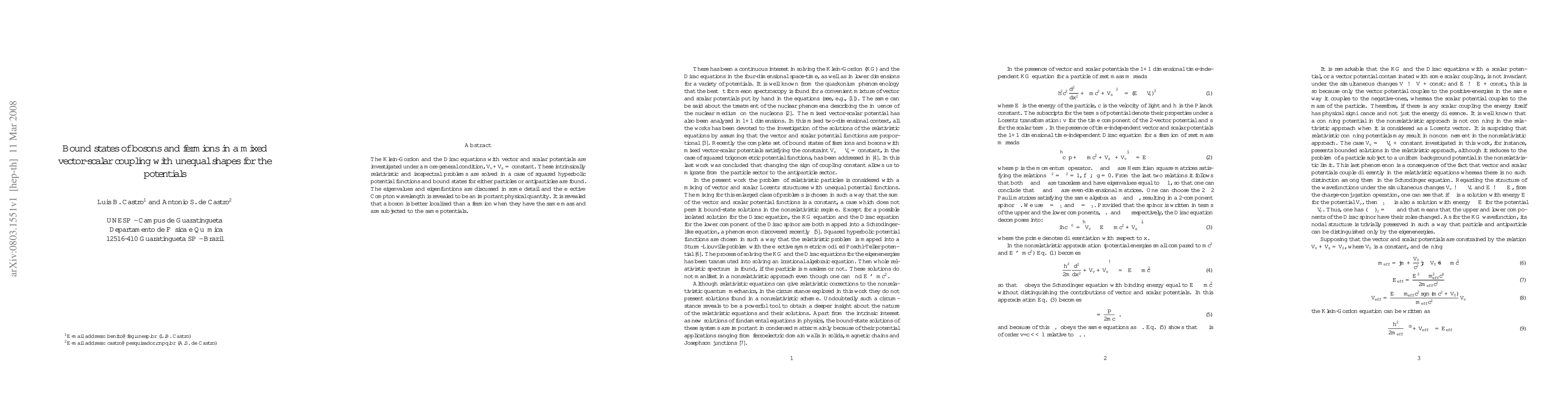 This paper investigates bound states of bosons and fermions in a mixed vector-scalar coupling with unequal shapes for the potentials, revealing that a boson is better localized than a fermion when they have the same mass and are subjected to the same potentials.