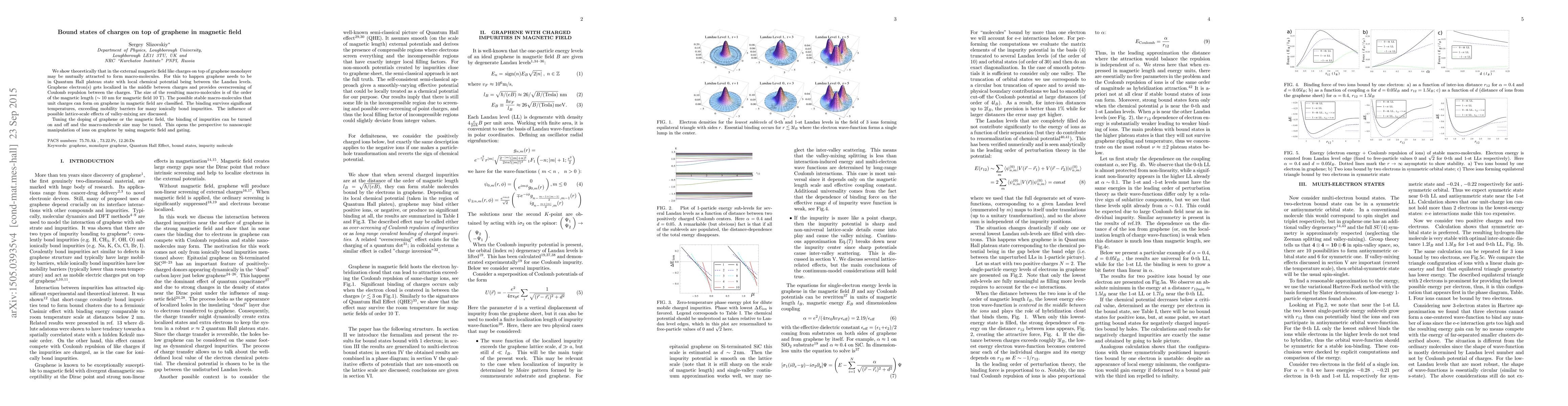 We show theoretically that in the external magnetic field like charges on top of graphene monolayer may be mutually attracted to form macro-molecules. For this to happen graphene needs to be in Quantum Hall plateau state with local chemical potential being between the Landau levels. Graphene electron(s) gets localized in the middle between charges and provides overscreening of Coulomb repulsion between the charges. The size of the resulting macro-molecules is of the order of the magnetic length ($\sim 10$ nm for magnetic field 10 T). The possible stable macro-molecules that unit charges can form on graphene in magnetic field are classified. The binding survives significant temperatures, exceeding mobility barriers for many ionically bond impurities. The influence of possible lattice-scale effects of valley-mixing are discussed. Tuning the doping of graphene or the magnetic field, the binding of impurities can be turned on and off and the macro-molecule size may be tuned. This opens the perspective to nanoscopic manipulation of ions on graphene by using magnetic field and gating.