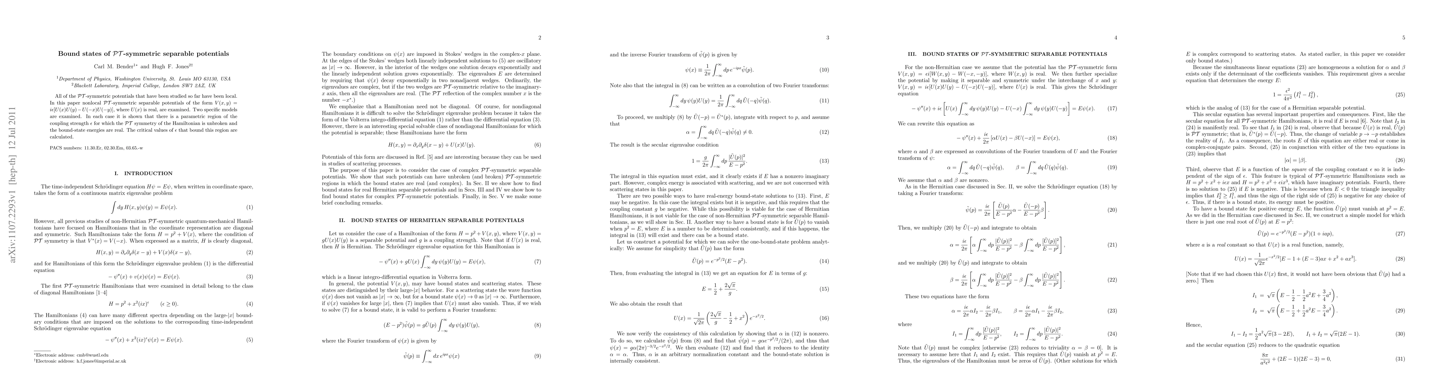 Researchers studied nonlocal PT-symmetric separable potentials, finding that bound-state energies are real for certain values of the coupling strength epsilon within a specific parameter range.