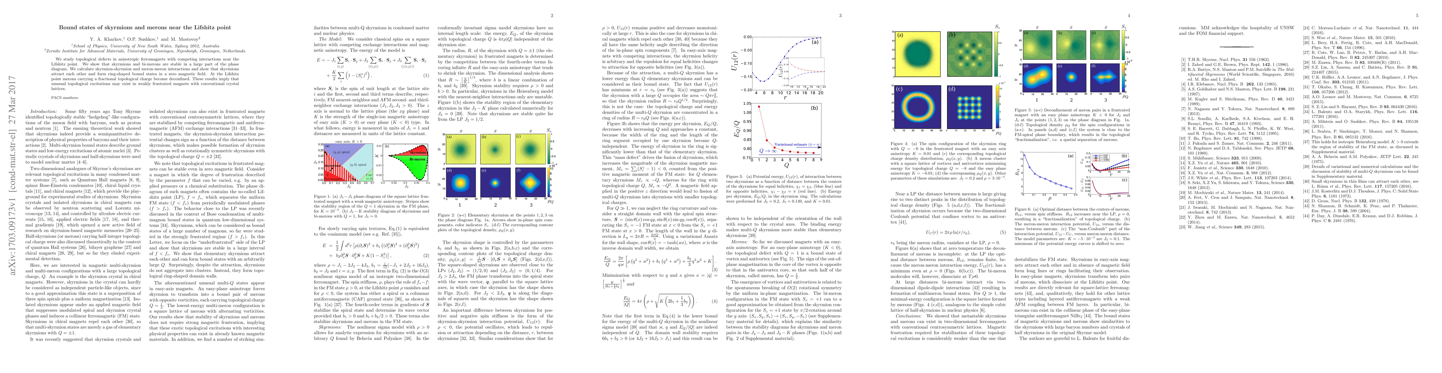 This paper investigates topological defects in anisotropic ferromagnets near the Lifshitz point, demonstrating the stability of skyrmions and bi-merons. It reveals that skyrmions attract each other to form ring-shaped bound states, while merons become deconfined at the Lifshitz point, suggesting unique topological excitations in weakly frustrated magnets.