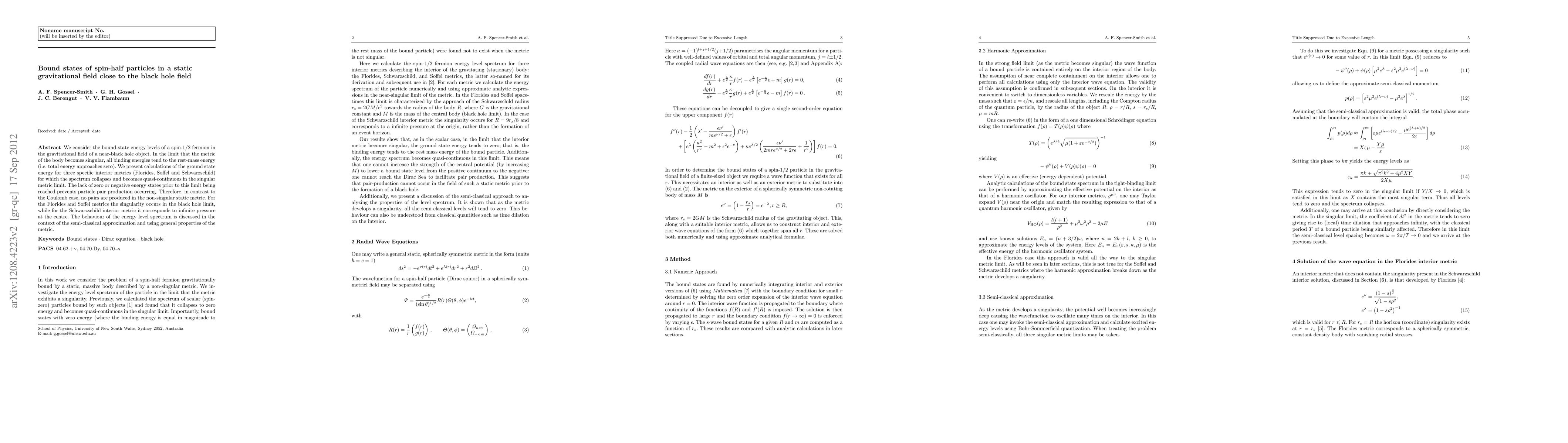 We consider the bound-state energy levels of a spin-1/2 fermion in the gravitational field of a near-black hole object. In the limit that the metric of the body becomes singular, all binding energies tend to the rest-mass energy (i.e. total energy approaches zero). We present calculations of the ground state energy for three specific interior metrics (Florides, Soffel and Schwarzschild) for which the spectrum collapses and becomes quasi-continuous in the singular metric limit. The lack of zero or negative energy states prior to this limit being reached prevents particle pair production occurring. Therefore, in contrast to the Coulomb case, no pairs are produced in the non-singular static metric. For the Florides and Soffel metrics the singularity occurs in the black hole limit, while for the Schwarzschild interior metric it corresponds to infinite pressure at the centre. The behaviour of the energy level spectrum is discussed in the context of the semi-classical approximation and using general properties of the metric.