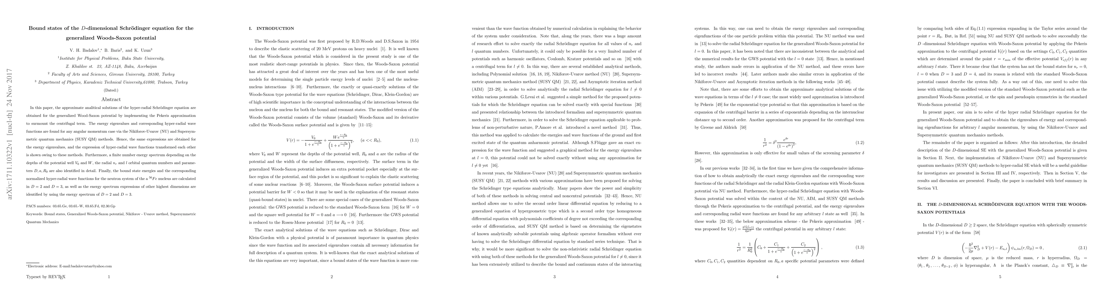 This paper presents analytical solutions for the $D$-dimensional Schrödinger equation with a generalized Woods-Saxon potential, using the Pekeris approximation and the Nikiforov-Uvarov and Supersymmetric quantum mechanics methods. The study identifies the energy spectrum and hyper-radial wave functions, and calculates bound state energies for the neutron system in a $^{56} Fe$ nucleus in $D=2$ and $D=3$ dimensions.