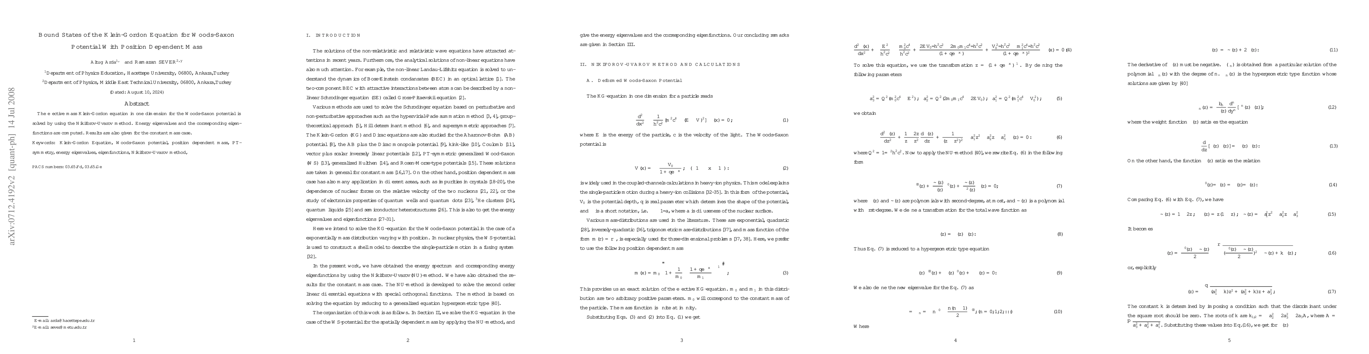 Summary: This paper solves the effective mass Klein-Gordon equation for a one-dimensional Woods-Saxon potential with position-dependent mass using the Nikiforov-Uvarov method, computing energy eigenvalues and eigenfunctions, and compares results to the constant mass case.