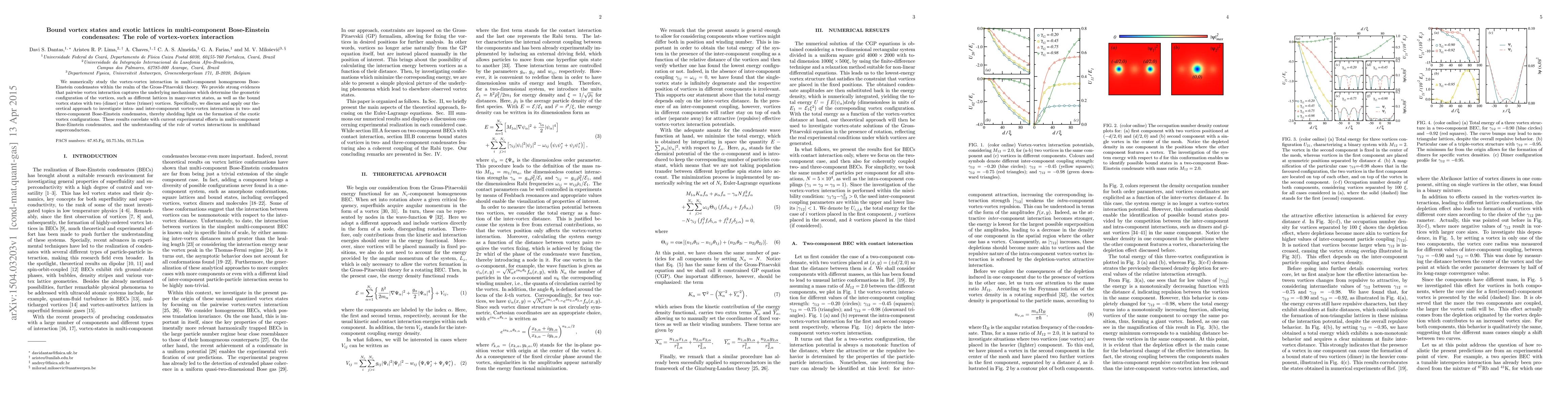 This research numerically investigates the vortex-vortex interaction in multi-component Bose-Einstein condensates, demonstrating that these interactions determine the geometric configurations of vortex lattices and bound vortex states. The study applies theoretical models to understand intra- and inter-component interactions, providing insights into exotic vortex configurations.