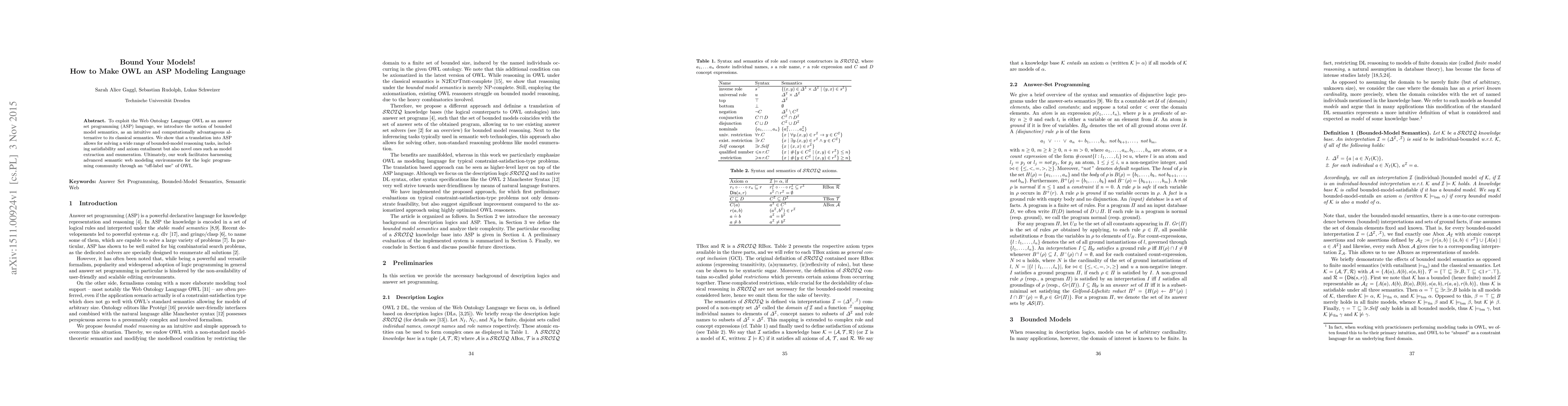 This paper proposes using bounded model semantics to translate OWL into ASP, enabling a range of reasoning tasks such as satisfiability and model extraction. This approach allows the logic programming community to leverage advanced semantic web modeling environments.
