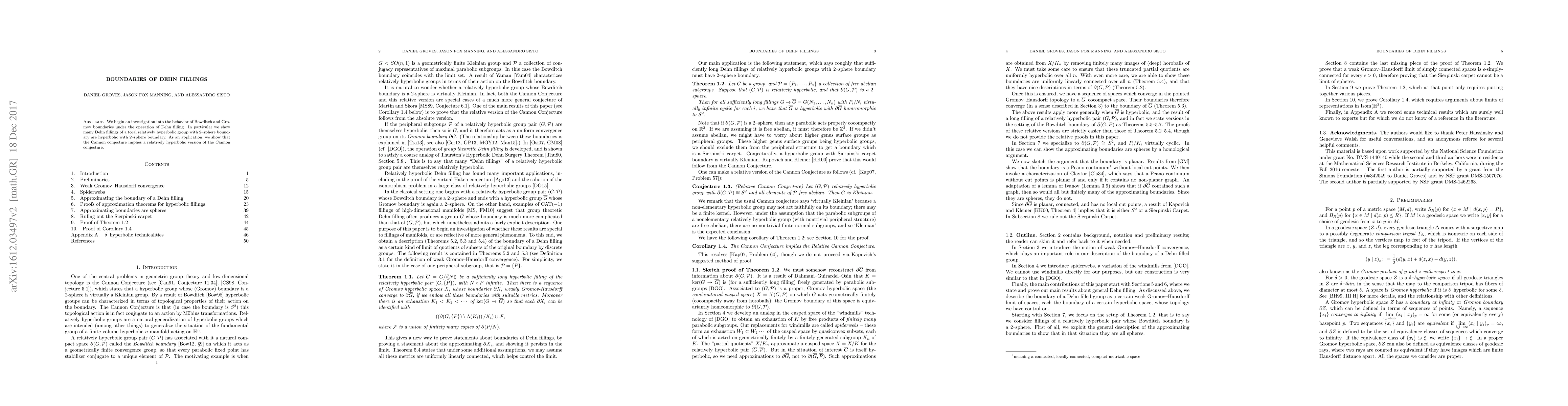 This paper explores how Bowditch and Gromov boundaries behave under Dehn filling, demonstrating that many Dehn fillings of a toral relatively hyperbolic group with 2-sphere boundary remain hyperbolic with 2-sphere boundary. It also applies the Cannon conjecture to imply a related relatively hyperbolic version.