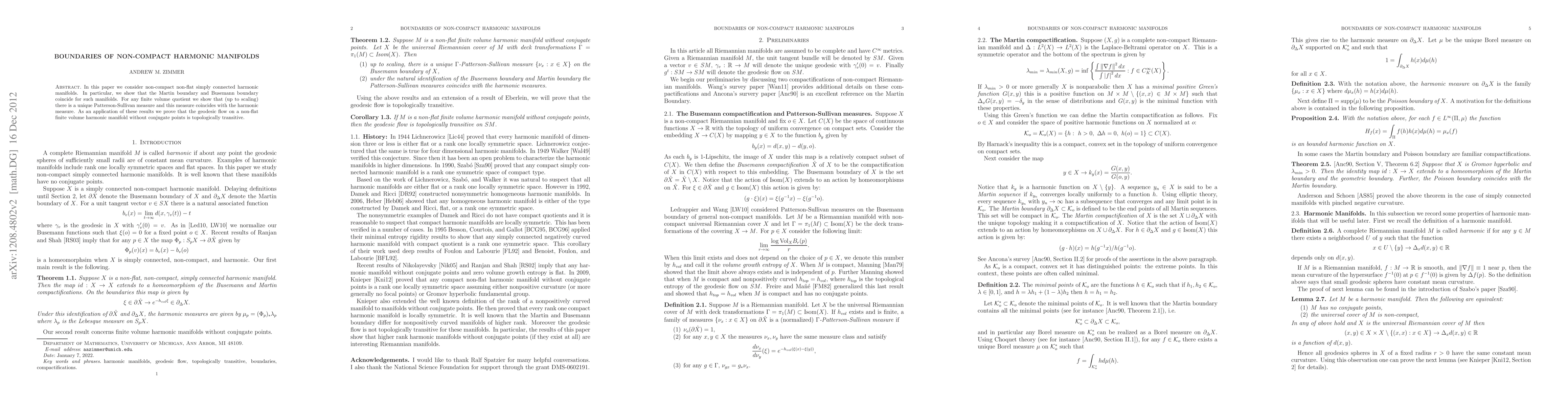 In this paper we consider non-compact non-flat simply connected harmonic manifolds. In particular, we show that the Martin boundary and Busemann boundary coincide for such manifolds. For any finite volume quotient we show that (up to scaling) there is a unique Patterson-Sullivan measure and this measure coincides with the harmonic measure. As an application of these results we prove that the geodesic flow on a non-flat finite volume harmonic manifold without conjugate points is topologically transitive.