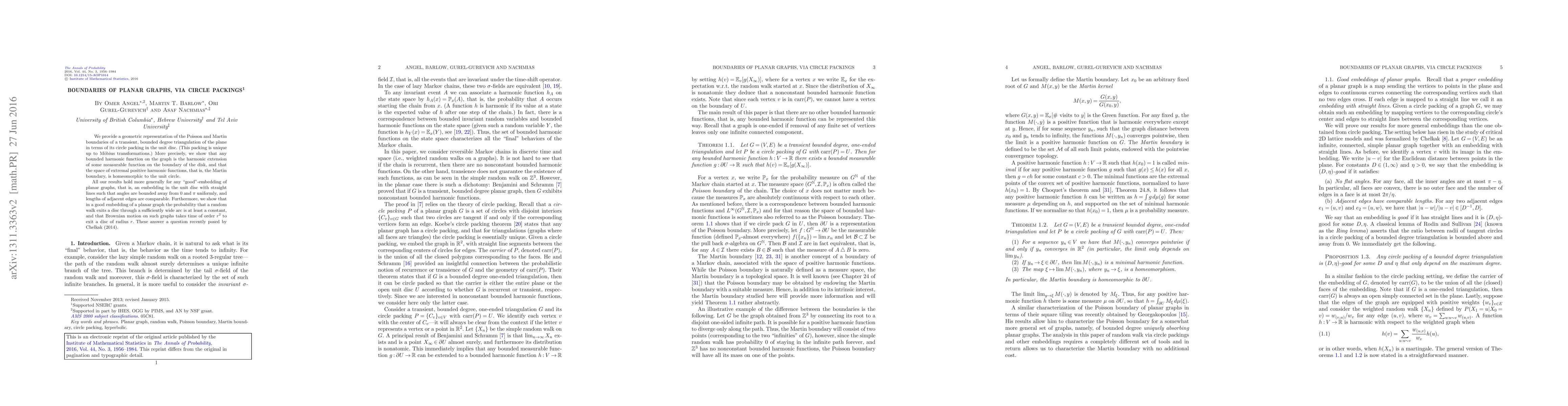 This paper establishes a geometric representation of the Poisson and Martin boundaries of planar graphs through circle packing in the unit disc, showing that bounded harmonic functions correspond to extensions of functions on the disk's boundary. It also proves that the Martin boundary is homeomorphic to the unit circle and addresses exit probabilities for random walks and Brownian motion in "good" planar graph embeddings.