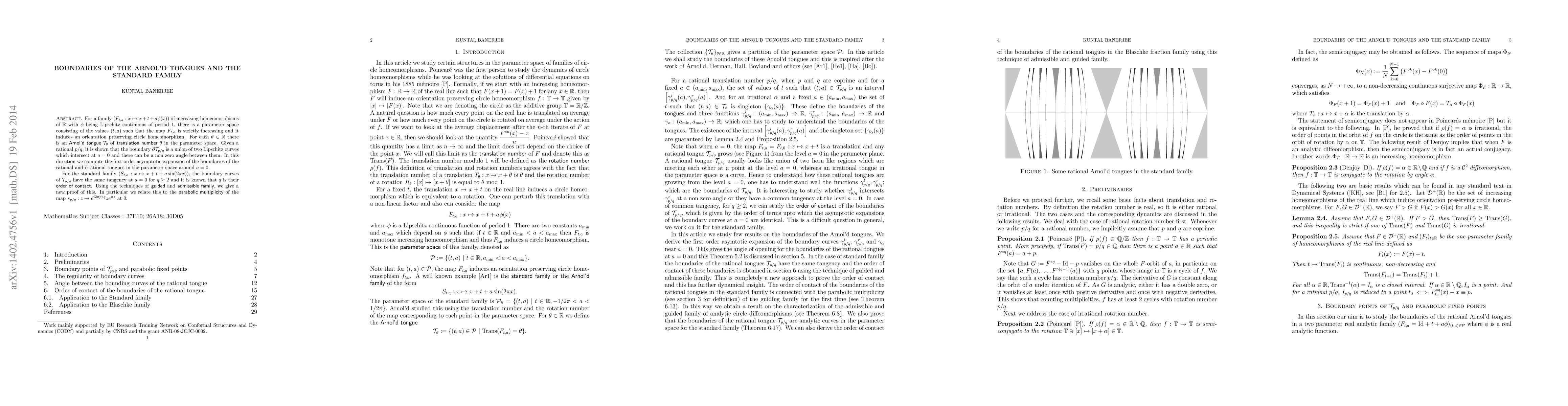 This paper investigates the boundaries of Arnol'd tongues in the parameter space of a family of increasing homeomorphisms, showing that the boundaries are composed of Lipschitz curves intersecting at a non-zero angle when $a=0$. For the standard family involving sine functions, it provides a new proof of tangency order at $a=0$ using guided and admissible families, linking it to the parabolic multiplicity of a specific map.