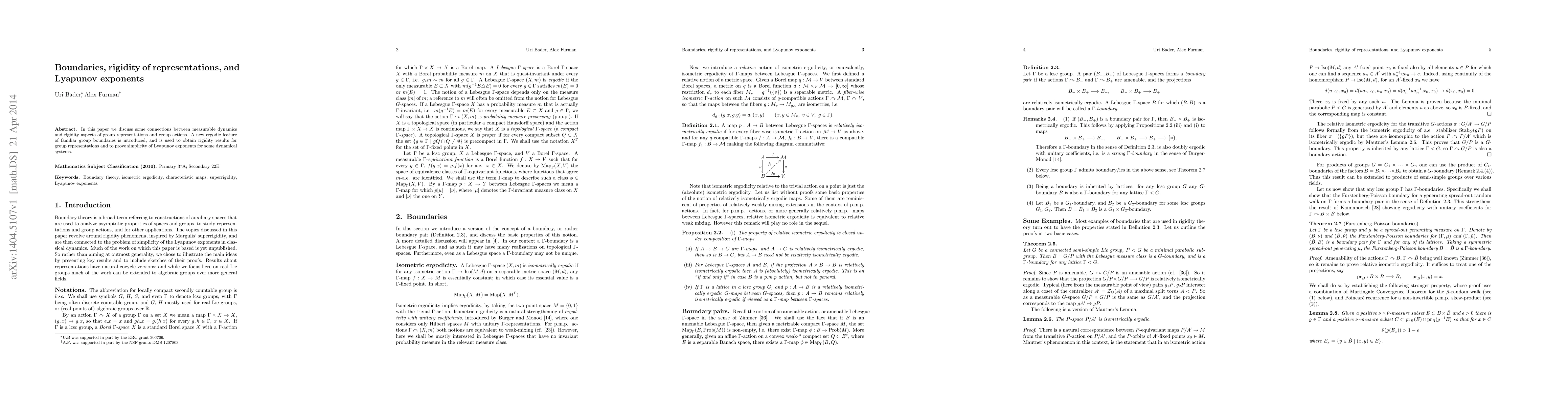 In this paper we discuss some connections between measurable dynamics and rigidity aspects of group representations and group actions. A new ergodic feature of familiar group boundaries is introduced, and is used to obtain rigidity results for group representations and to prove simplicity of Lyapunov exponents for some dynamical systems.