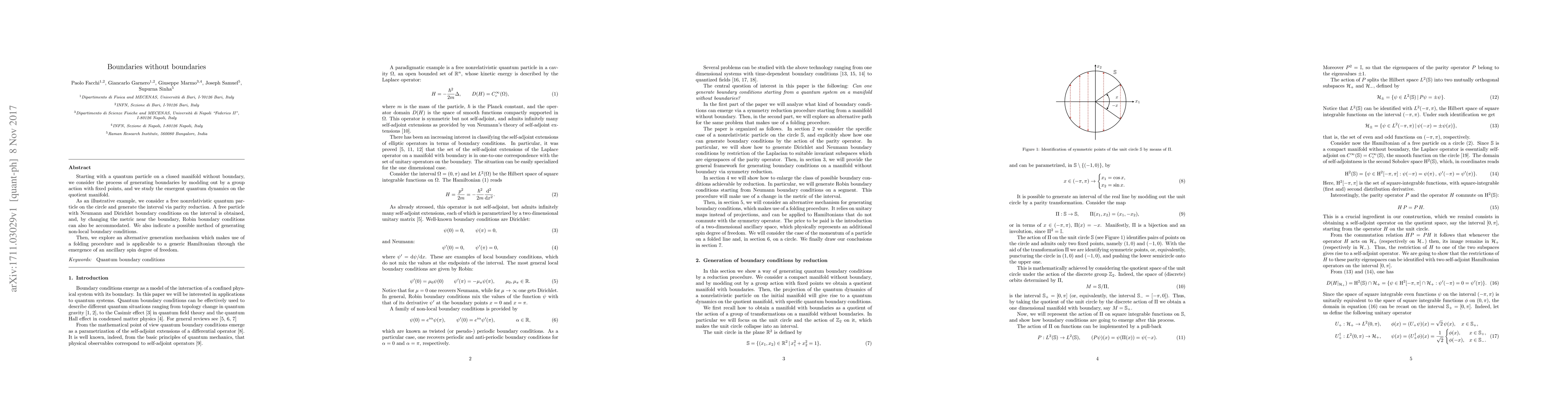 Starting with a quantum particle on a closed manifold without boundary, we consider the process of generating boundaries by modding out by a group action with fixed points, and we study the emergent quantum dynamics on the quotient manifold. As an illustrative example, we consider a free nonrelativistic quantum particle on the circle and generate the interval via parity reduction. A free particle with Neumann and Dirichlet boundary conditions on the interval is obtained, and, by changing the metric near the boundary, Robin boundary conditions can also be accommodated. We also indicate a possible method of generating non-local boundary conditions. Then, we explore an alternative generation mechanism which makes use of a folding procedure and is applicable to a generic Hamiltonian through the emergence of an ancillary spin degree of freedom.