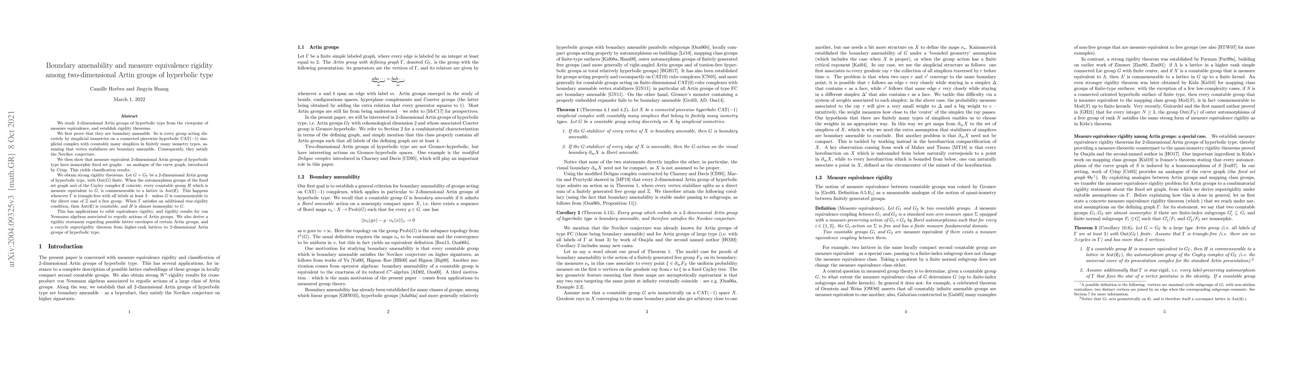 We study $2$-dimensional Artin groups of hyperbolic type from the viewpoint of measure equivalence, and establish rigidity theorems. We first prove that they are boundary amenable. So is every group acting discretely by simplicial isometries on a connected piecewise hyperbolic $\mathrm{CAT}(-1)$ simplicial complex with countably many simplices in finitely many isometry types, assuming that vertex stabilizers are boundary amenable. Consequently, they satisfy the Novikov conjecture. We then show that measure equivalent $2$-dimensional Artin groups of hyperbolic type have isomorphic fixed set graphs -- an analogue of the curve graph, introduced by Crisp. This yields classification results. We obtain strong rigidity theorems. Let $G=G_\Gamma$ be a $2$-dimensional Artin group of hyperbolic type, with $\mathrm{Out}(G)$ finite. When the automorphism groups of the fixed set graph and of the Cayley complex $\mathfrak{C}$ coincide, every countable group $H$ which is measure equivalent to $G$, is commensurable to a lattice in $\mathrm{Aut}(\mathfrak{C})$. This happens whenever $\Gamma$ is triangle-free with all labels at least $3$ -- unless $G$ is commensurable to the direct sum of $\mathbb{Z}$ and a free group. When $\Gamma$ satisfies an additional star-rigidity condition, then $\mathrm{Aut}(\mathfrak{C})$ is countable, and $H$ is almost isomorphic to $G$. This has applications to orbit equivalence rigidity, and rigidity results for von Neumann algebras associated to ergodic actions of Artin groups. We also derive a rigidity statement regarding possible lattice envelopes of certain Artin groups, and a cocycle superrigidity theorem from higher-rank lattices to $2$-dimensional Artin groups of hyperbolic type.