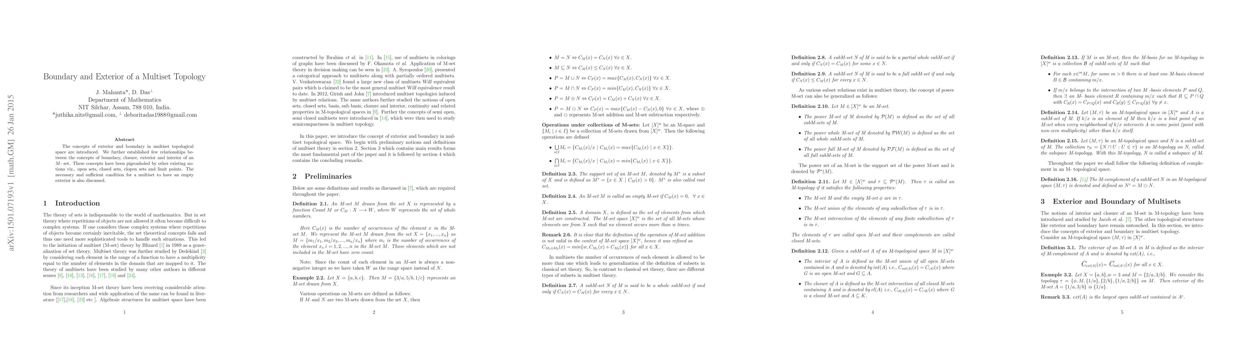 The concepts of exterior and boundary in multiset topological space are introduced. We further established few relationships between the concepts of boundary, closure, exterior and interior of an M- set. These concepts have been pigeonholed by other existing notions viz., open sets, closed sets, clopen sets and limit points. The necessary and sufficient condition for a multiset to have an empty exterior is also discussed.