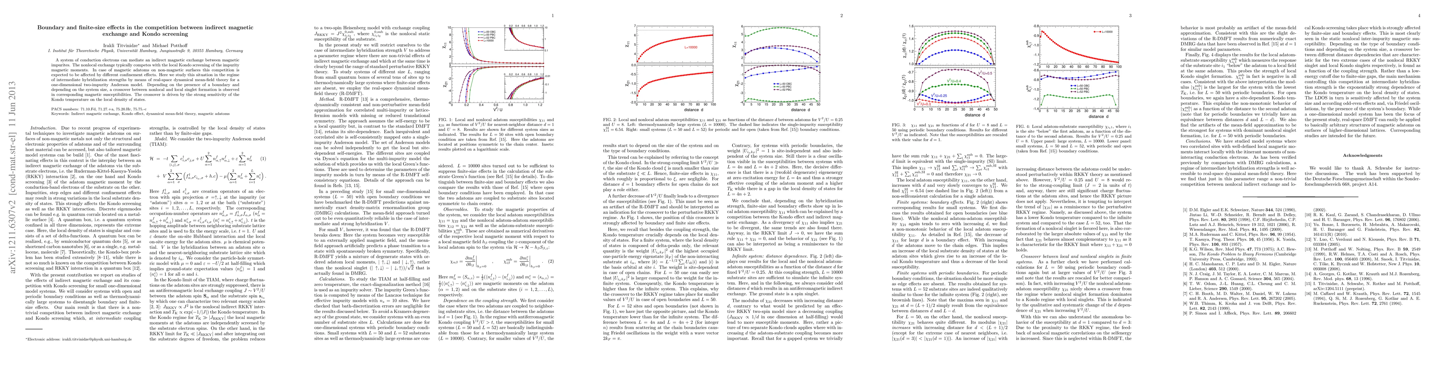 A system of conduction electrons can mediate an indirect magnetic exchange between magnetic impurites. The nonlocal exchange typically competes with the local Kondo screening of the impurity magnetic moments. In case of magnetic adatoms on non-magnetic surfaces this competition is expected to be affected by different confinement effects. Here we study this situation in the regime of intermediate hybridization strengths by means of real-space dynamical mean-field theory for a one-dimensional two-impurity Anderson model. Depending on the presence of a boundary and depending on the system size, a crossover between nonlocal and local singlet formation is observed in corresponding magnetic susceptibilities. The crossover is driven by the strong sensitivity of the Kondo temperature on the local density of states.